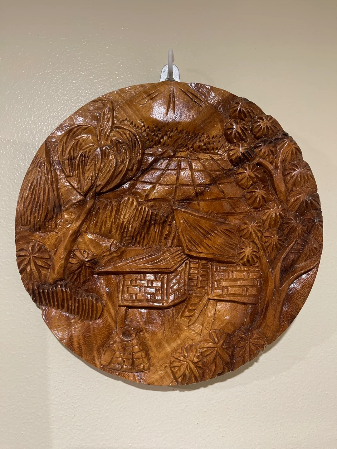 This is a carved wooden plaque featuring a tropical village scene with huts and palm trees. It's a round piece with a rich, warm wood finish. It's designed to be hung on a wall.