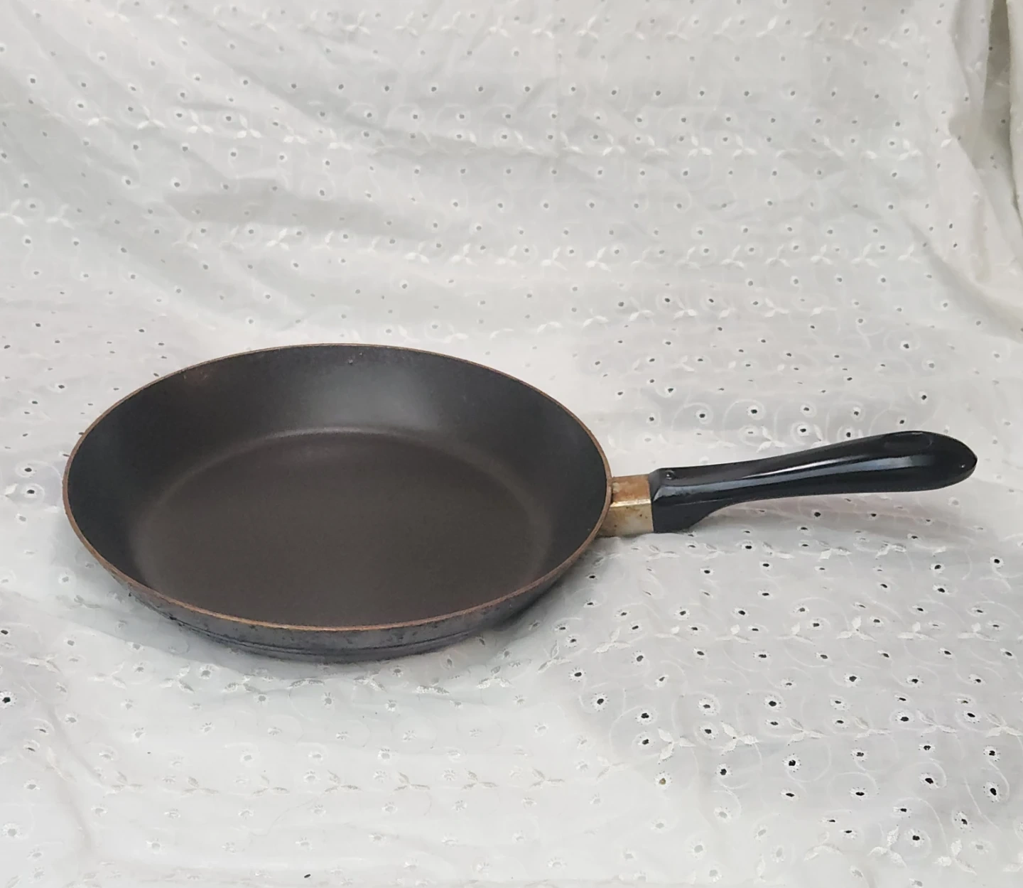 This is a frying pan with a black handle. It's made of metal. It's good for frying your favourite foods!