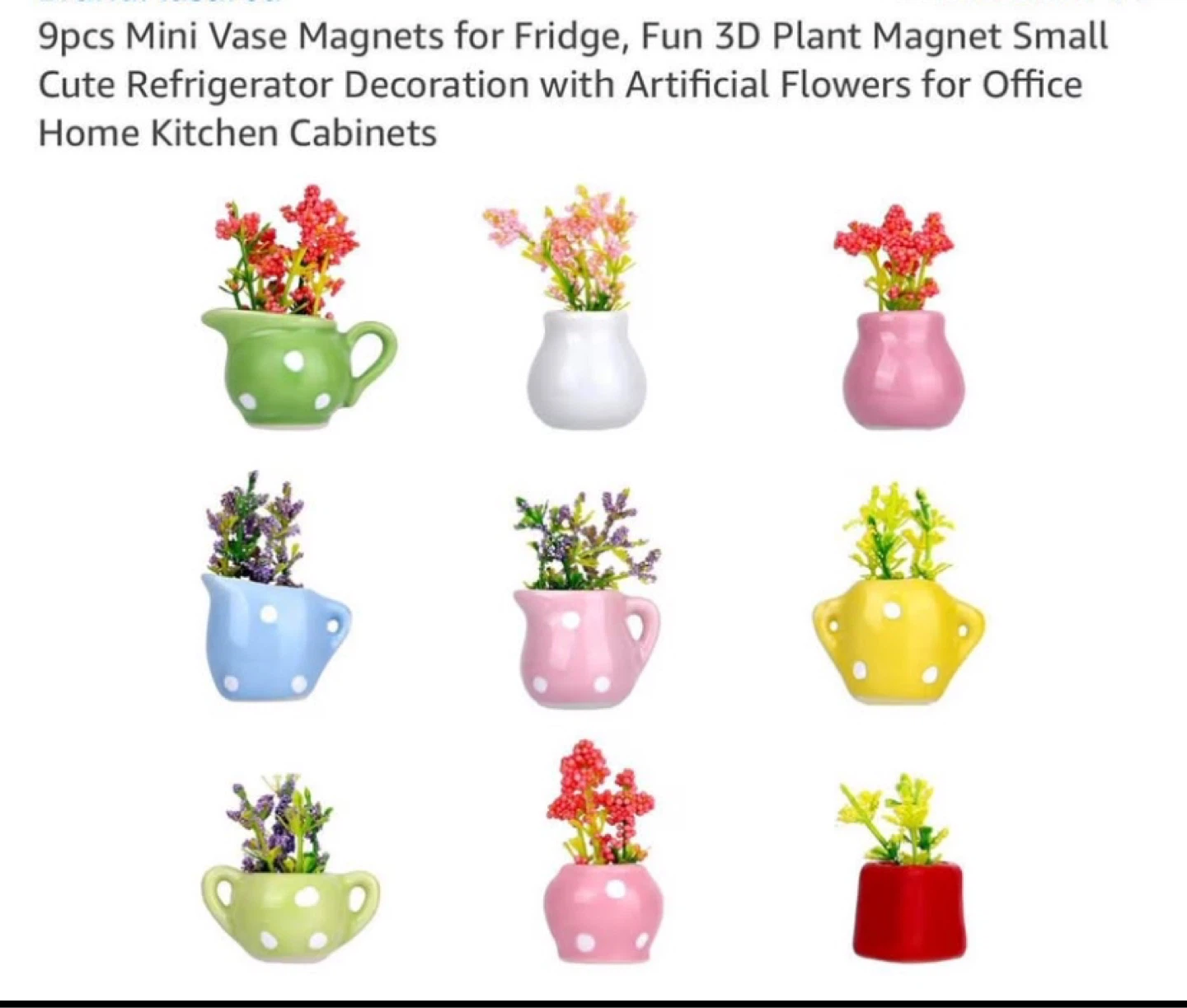 Six pcs mini vase magnets featuring artificial flowers. These cute refrigerator decorations add a touch of fun to your kitchen cabinets or office space.