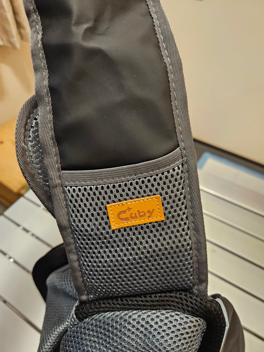 This Cuby pet sling carrier is made with breathable mesh fabric. It features a zippered main compartment and a small pocket for essentials. It's designed for small pets to travel comfortably.