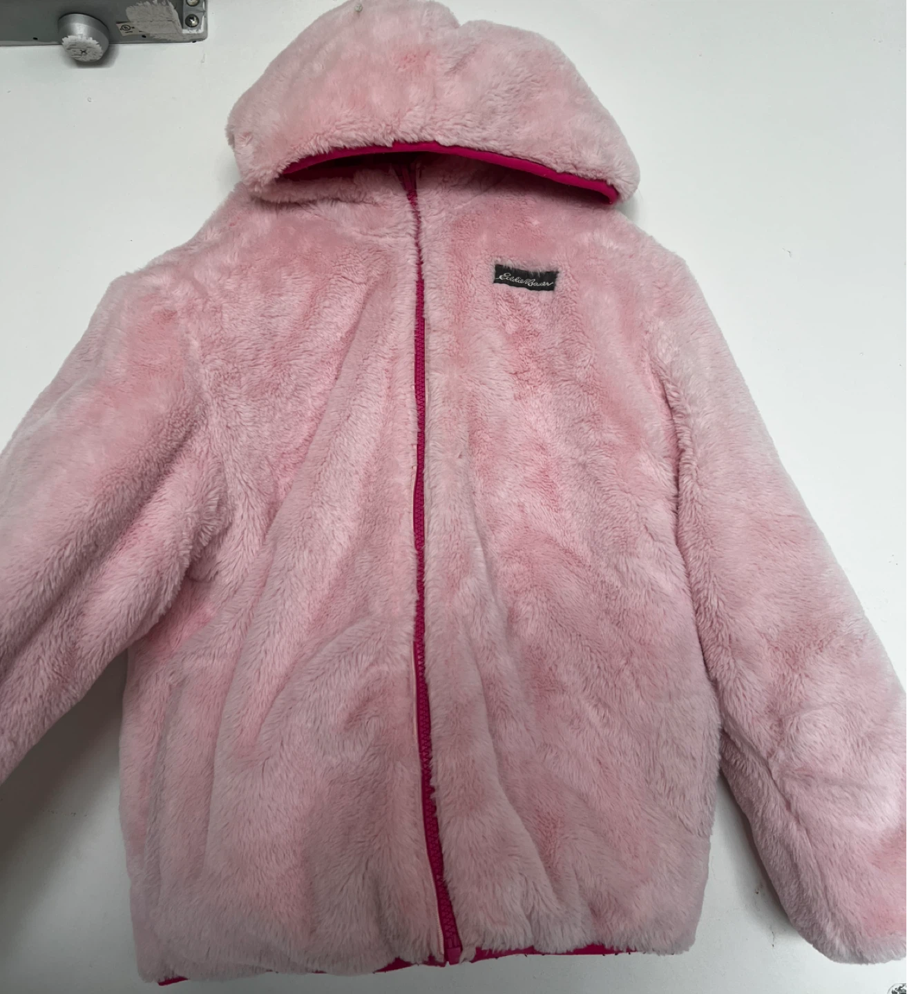 Super cute reversible jacket! One side is a soft, fluffy pink, and the other is a quilted ombre of pink, purple, and blue. Perfect for keeping cozy on chilly days