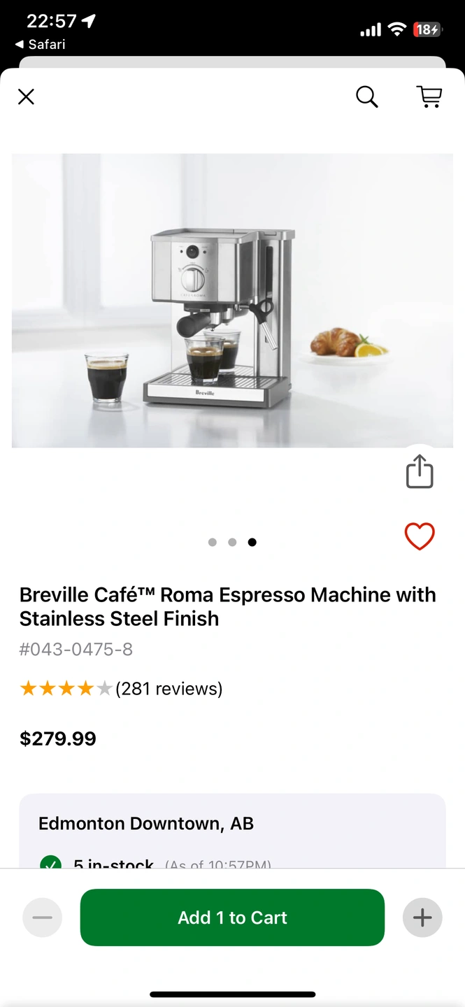 More info: https://canadiantire.ca/en/pdp/breville-cafe-roma-espresso-machine-with-stainless-steel-finish-0430475p.html