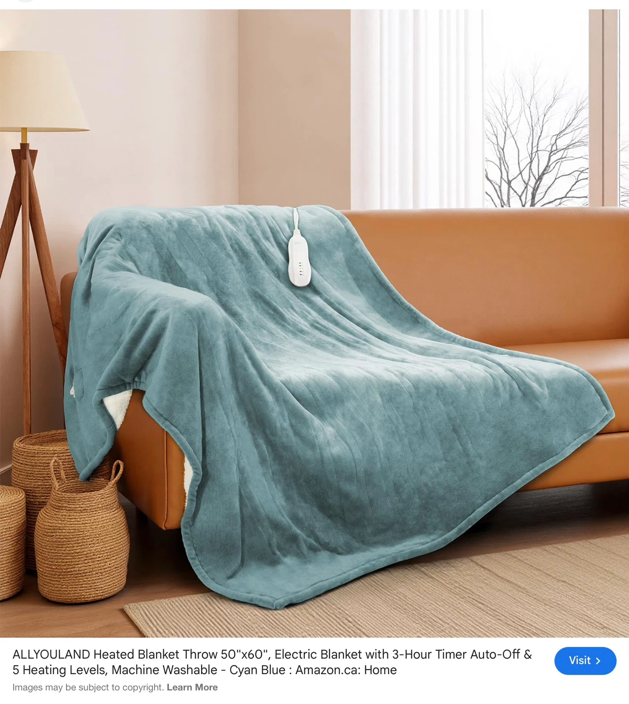 This ALLYOULAND electric throw blanket is 50"x60" and made of polyester. It features 5 heat settings and a 3-hour auto-off timer. It's machine washable and skin-friendly. Perfect for staying warm on chilly days!