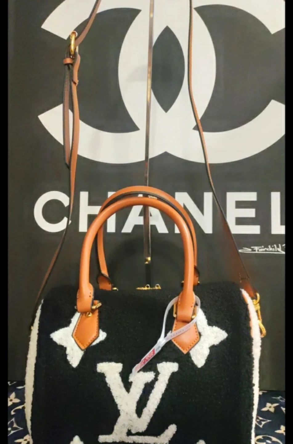 Monogrammed Speedy bag in black with white accents. Features tan leather trim and strap. Includes a detachable shoulder strap.