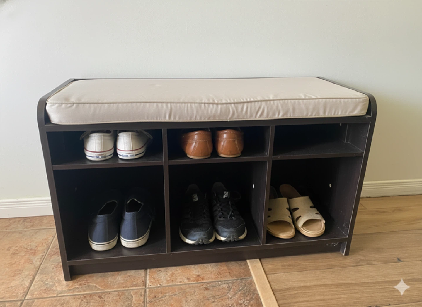 Selling a dark brown shoe rack bench with a cream-coloured cushion on top. It has six compartments for storing shoes or other items. A great addition to any entryway or closet!
