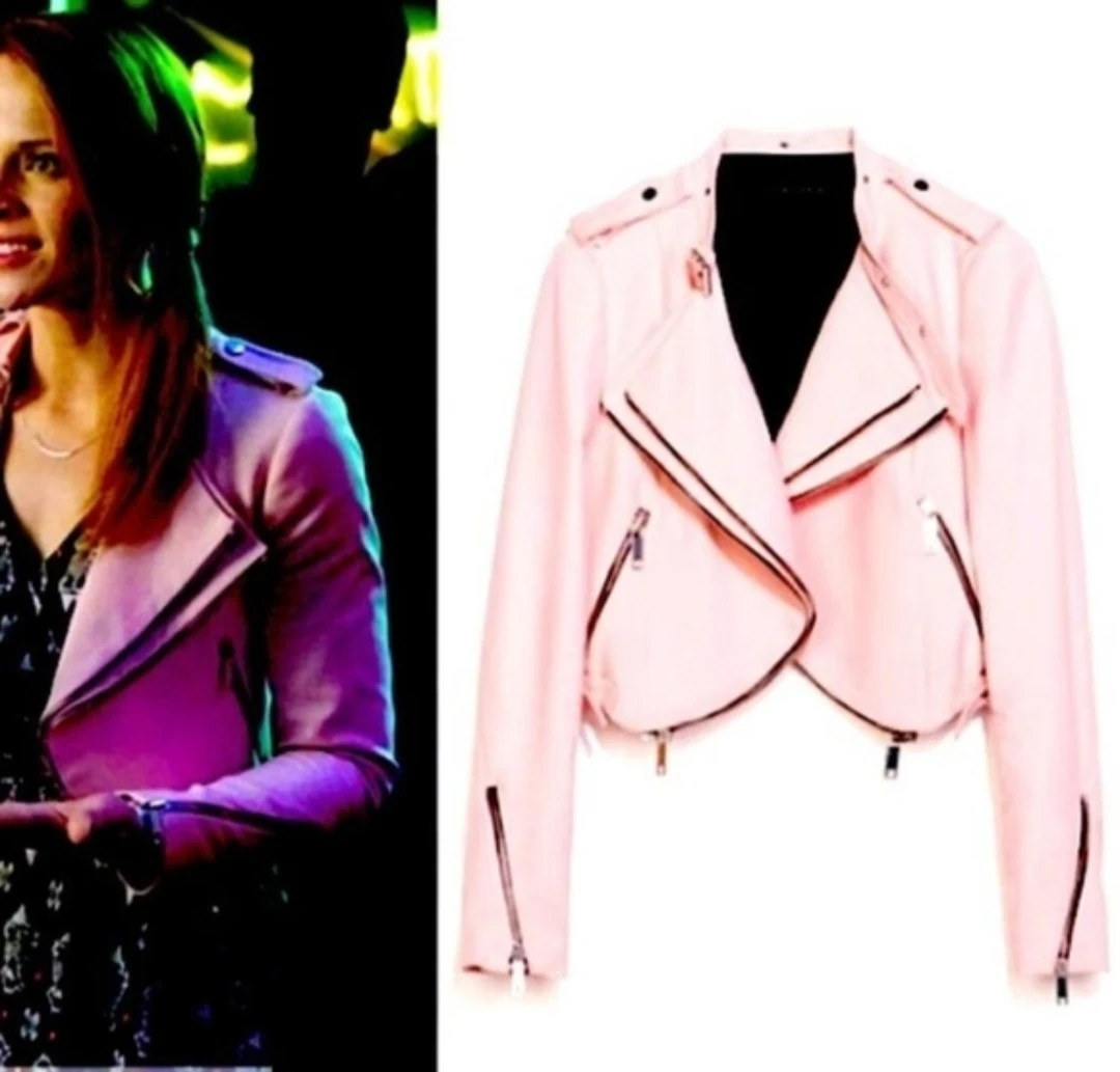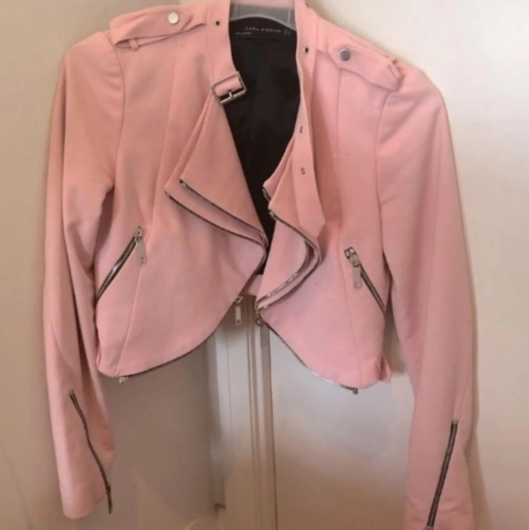 Zara Woman cropped moto jacket in a soft pink colour. This jacket features a zip-up front, lapels, and zippered cuffs. It's made in Morocco. Size XS.