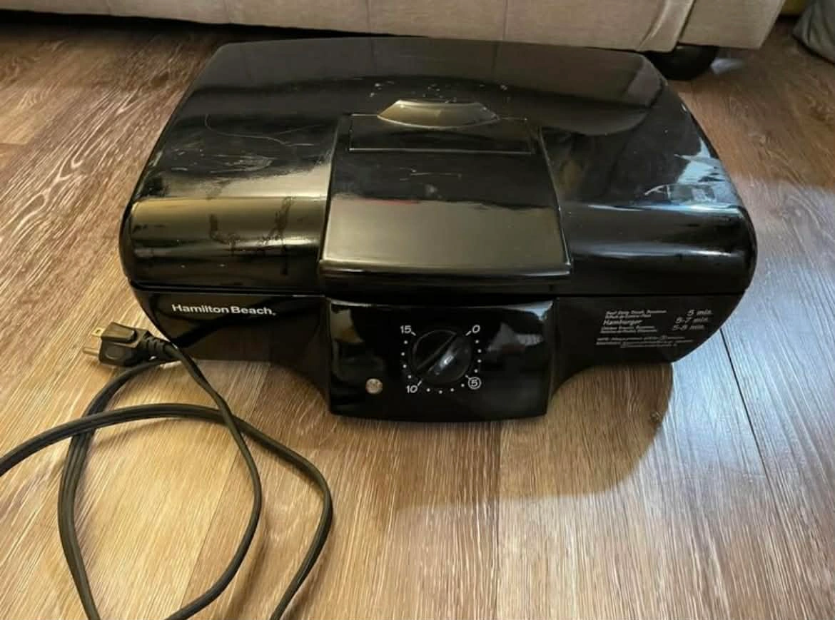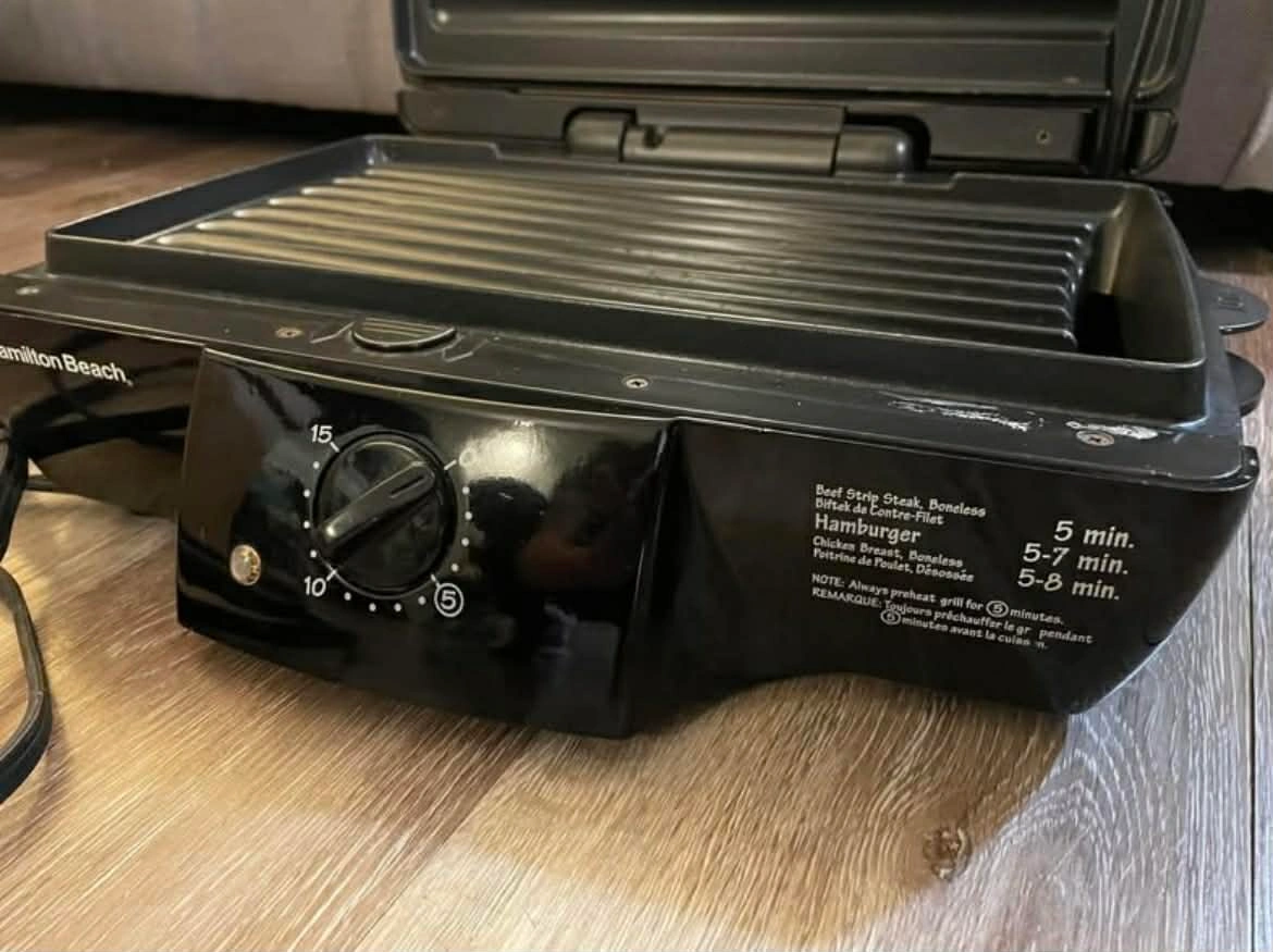 Hamilton Beach electric grill for sale. It features a non-stick surface and a 15-minute timer. Great for cooking burgers, chicken and steaks quickly!