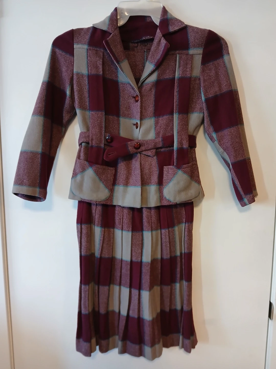Vintage Nancy Lou Limited skirt suit set featuring a blazer and pleated skirt. Both pieces have a classic plaid pattern in maroon, grey, and blue. This set offers a timeless look for any occasion!