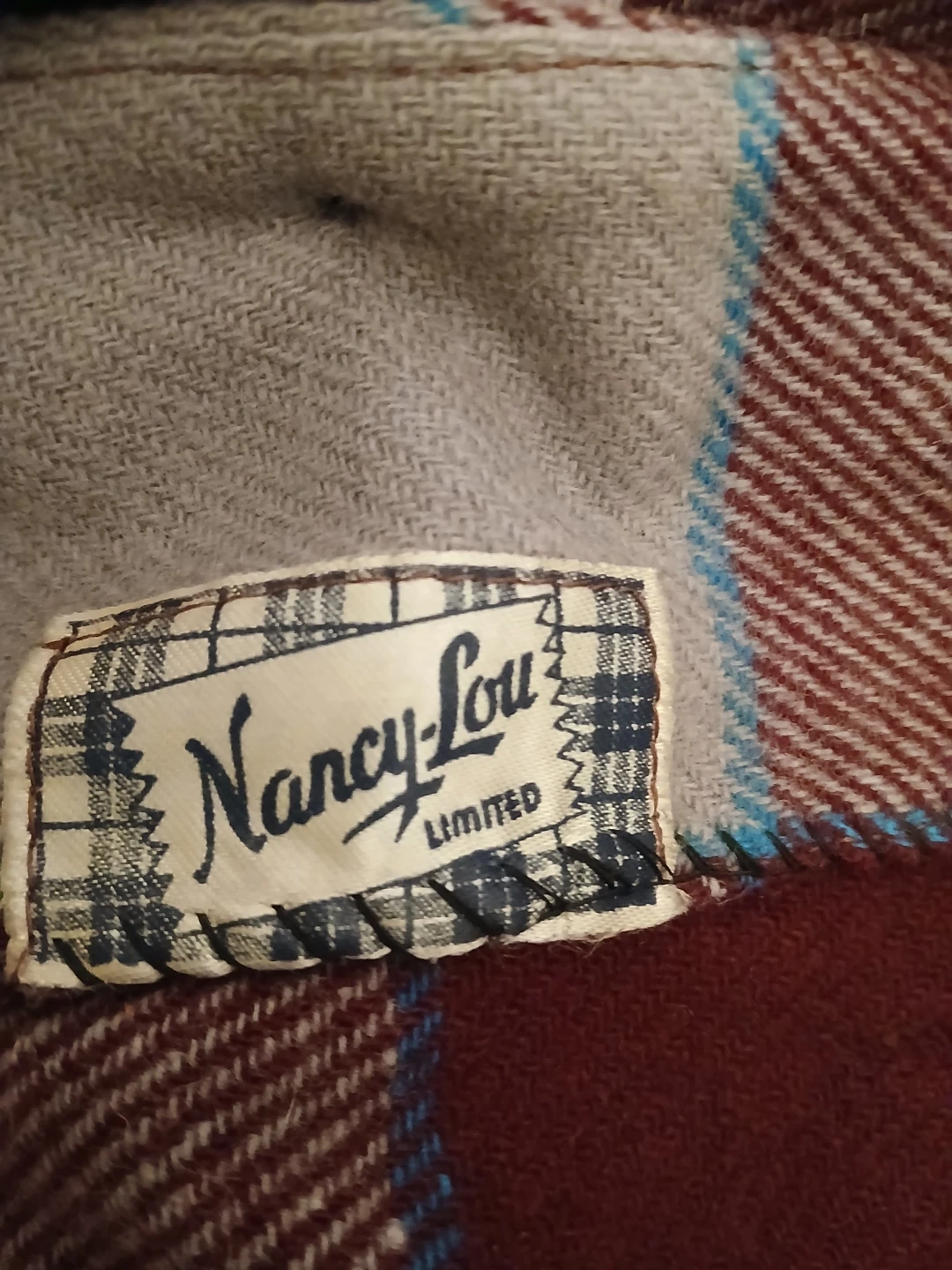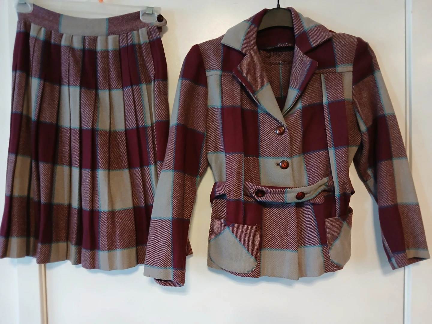 Vintage Nancy Lou Limited skirt suit set featuring a blazer and pleated skirt. Both pieces have a classic plaid pattern in maroon, grey, and blue. This set offers a timeless look for any occasion!