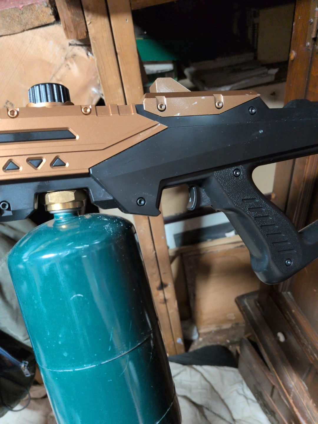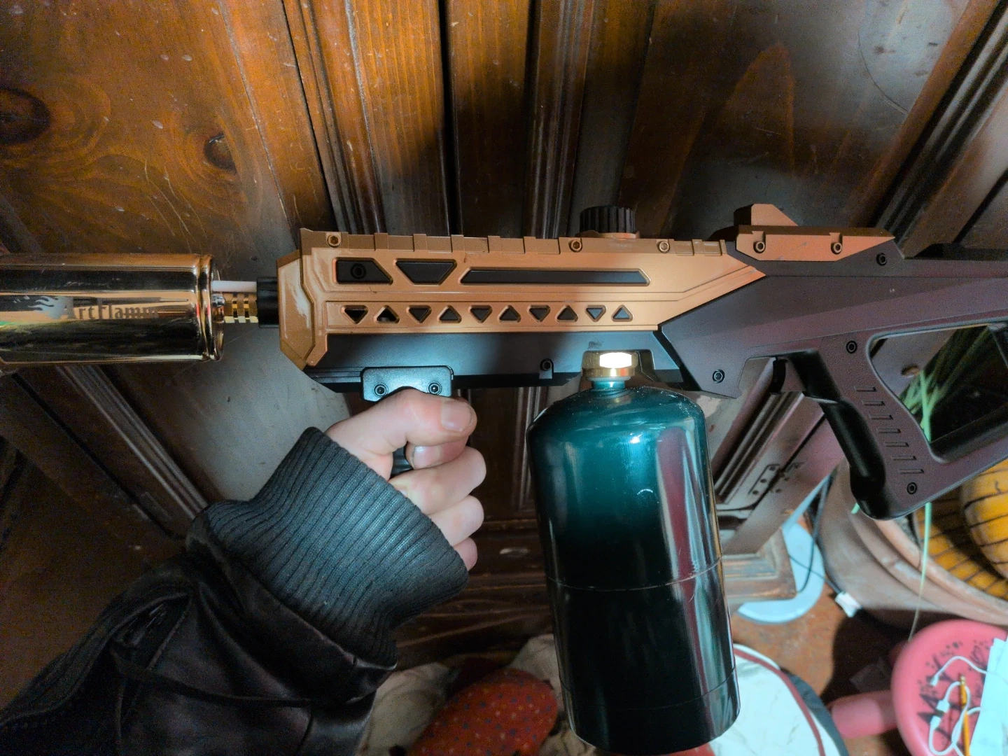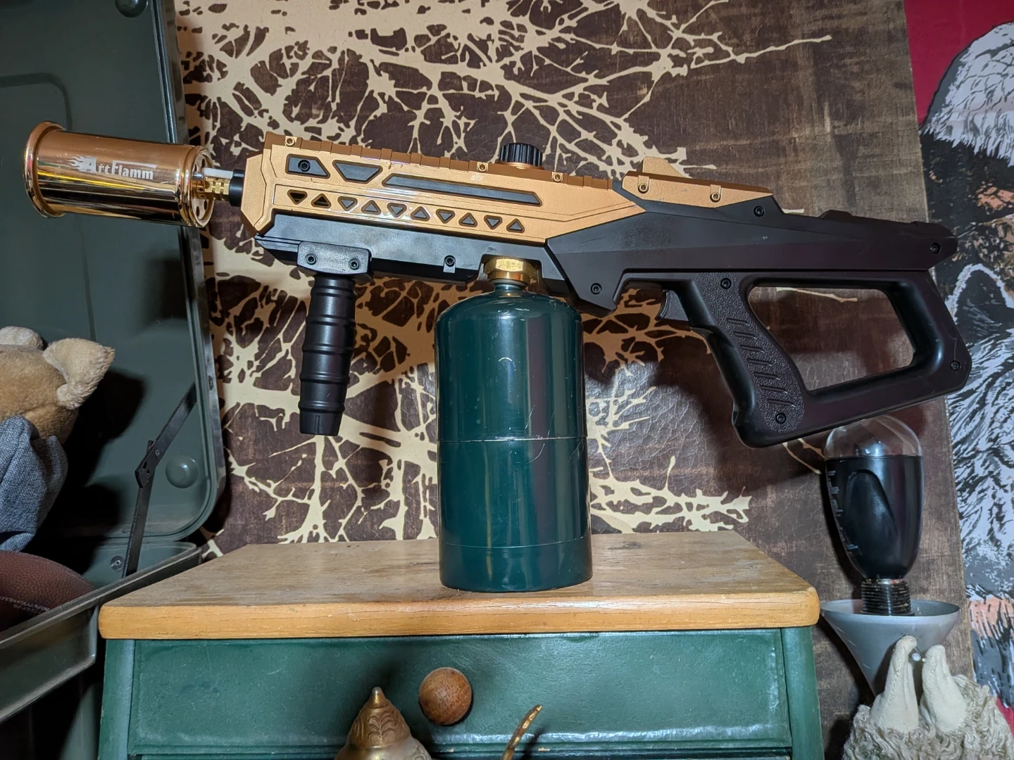 This is the ArcFlamm propane torch kit. It's gold and black with a green propane tank. It comes with the torch and tank.
