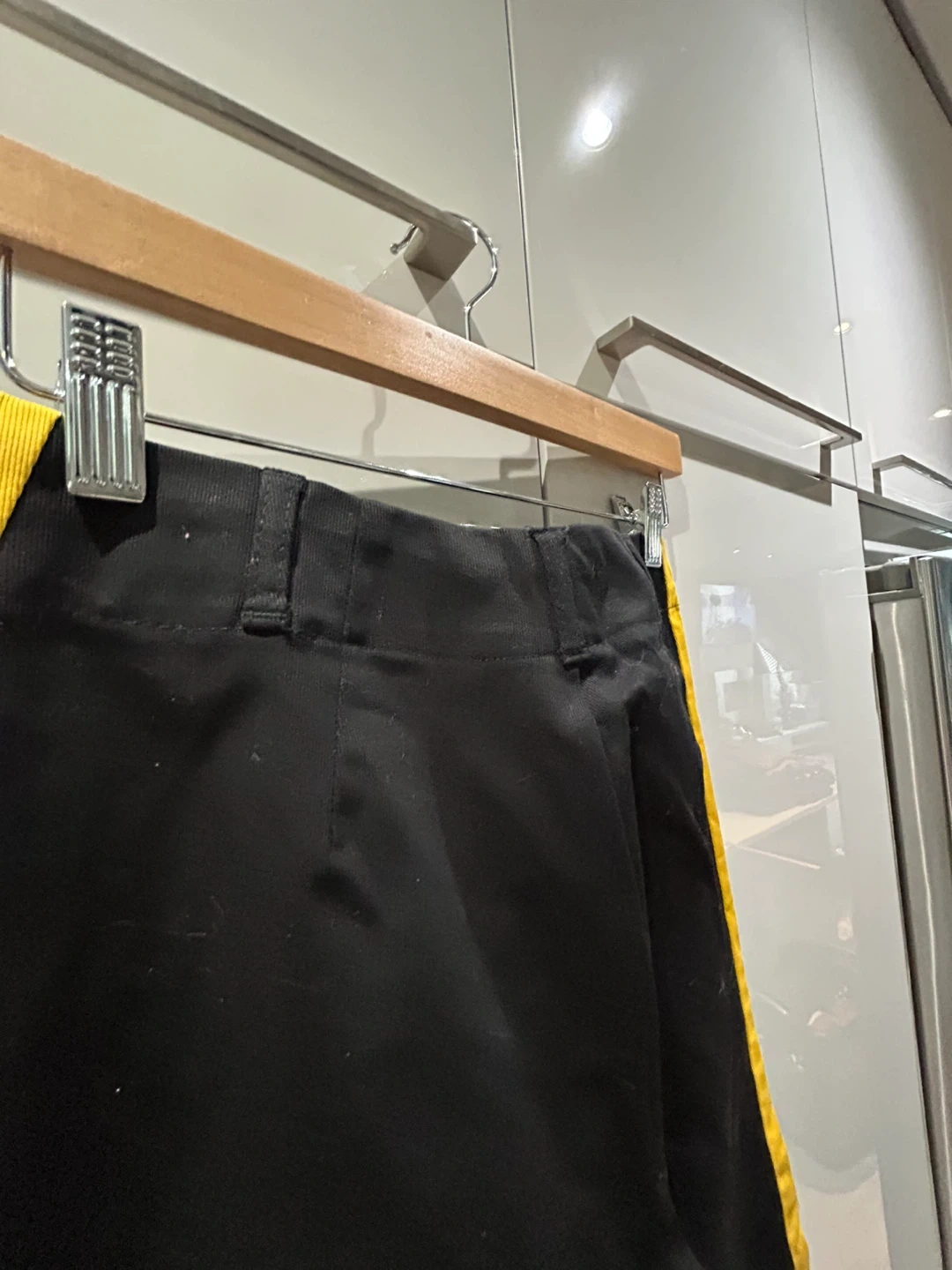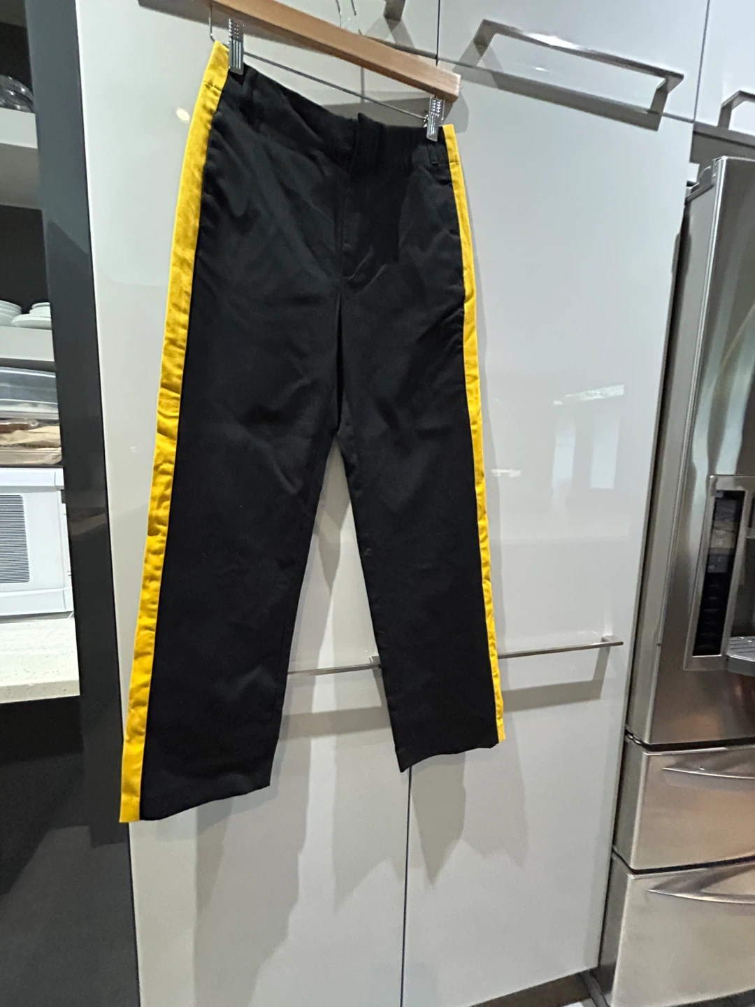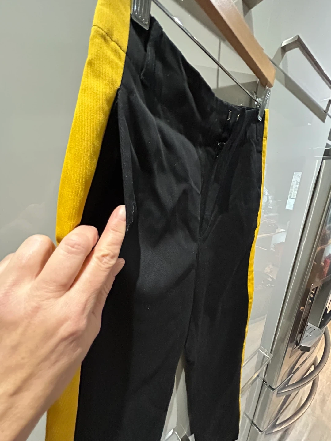 ZARA Trafaluc collection black pants feature a bright yellow stripe down each side. They have a button and zipper closure.