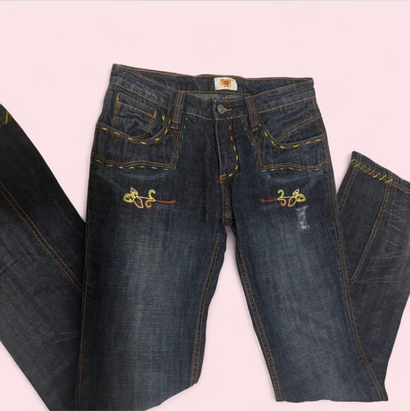 Dark wash bootcut jeans with colourful embroidered details on the pockets and leg. These jeans have a leather patch with the Antik Denim logo. Denim material.