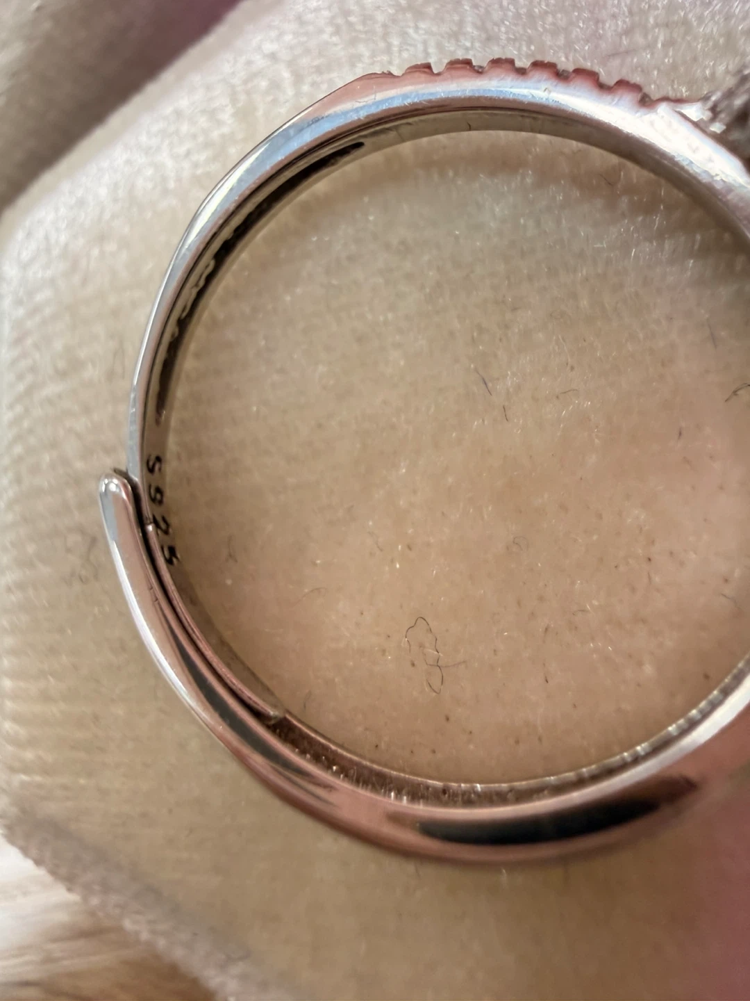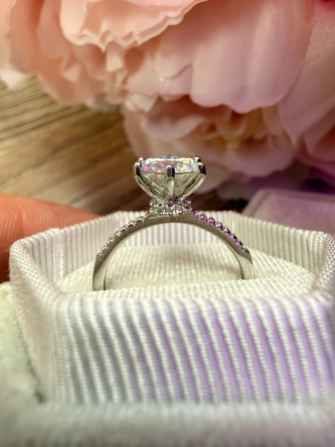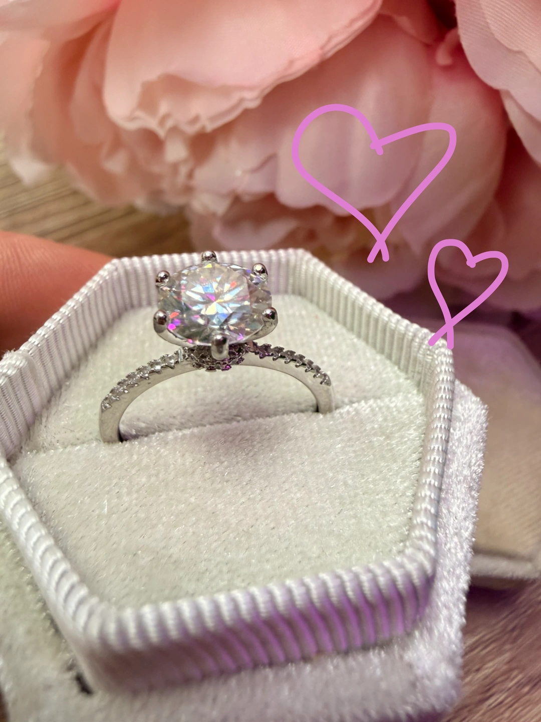 Beautiful moissanite ring featuring a large, brilliant-cut centre stone and smaller accent stones along the band. It's made of sterling silver, marked S925. Size is adjustable!