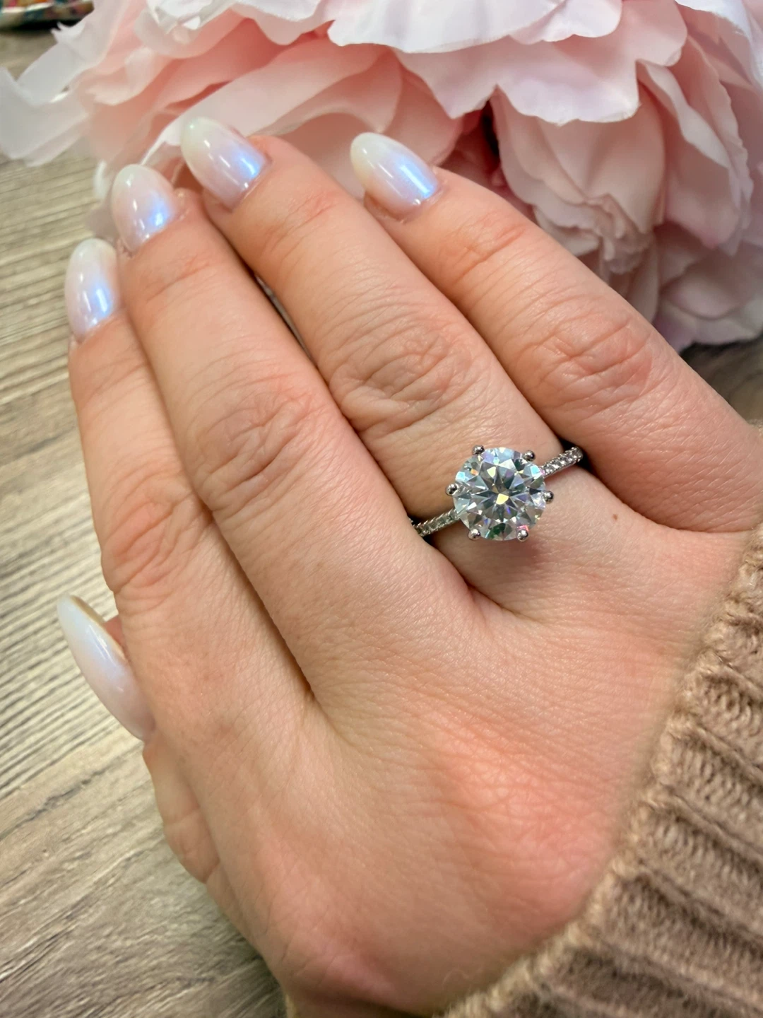 Beautiful moissanite ring featuring a large, brilliant-cut centre stone and smaller accent stones along the band. It's made of sterling silver, marked S925. Size is adjustable!