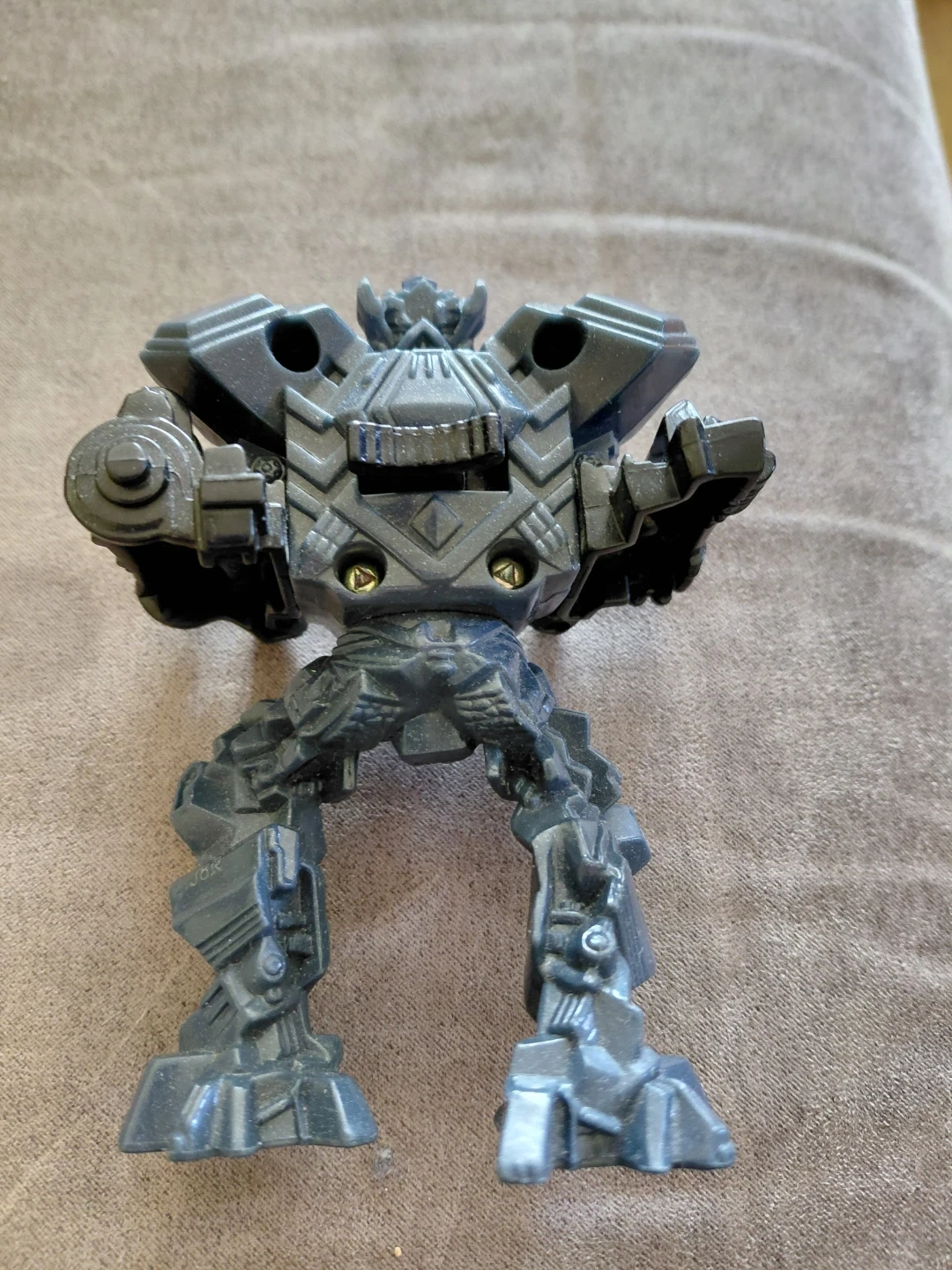 A grey Transformers action figure. It features articulated limbs for posing. This toy is great for kids who enjoy imaginative play!