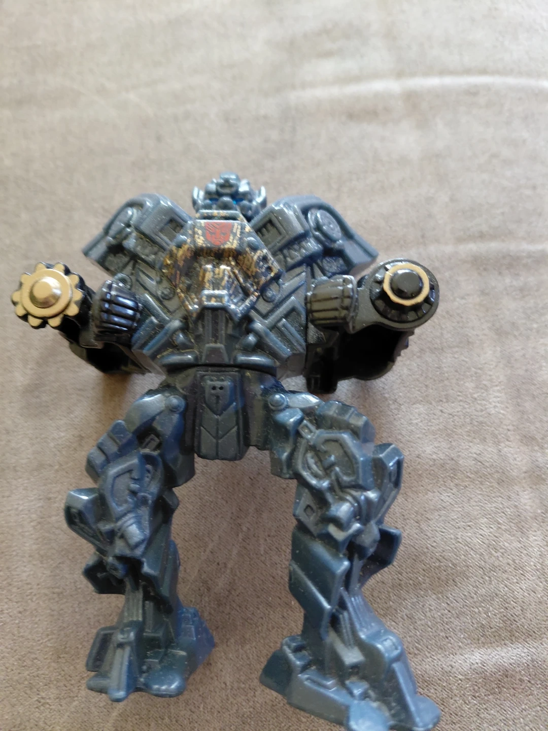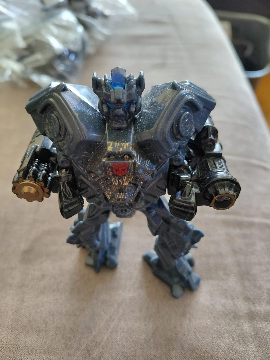 A grey Transformers action figure. It features articulated limbs for posing. This toy is great for kids who enjoy imaginative play!