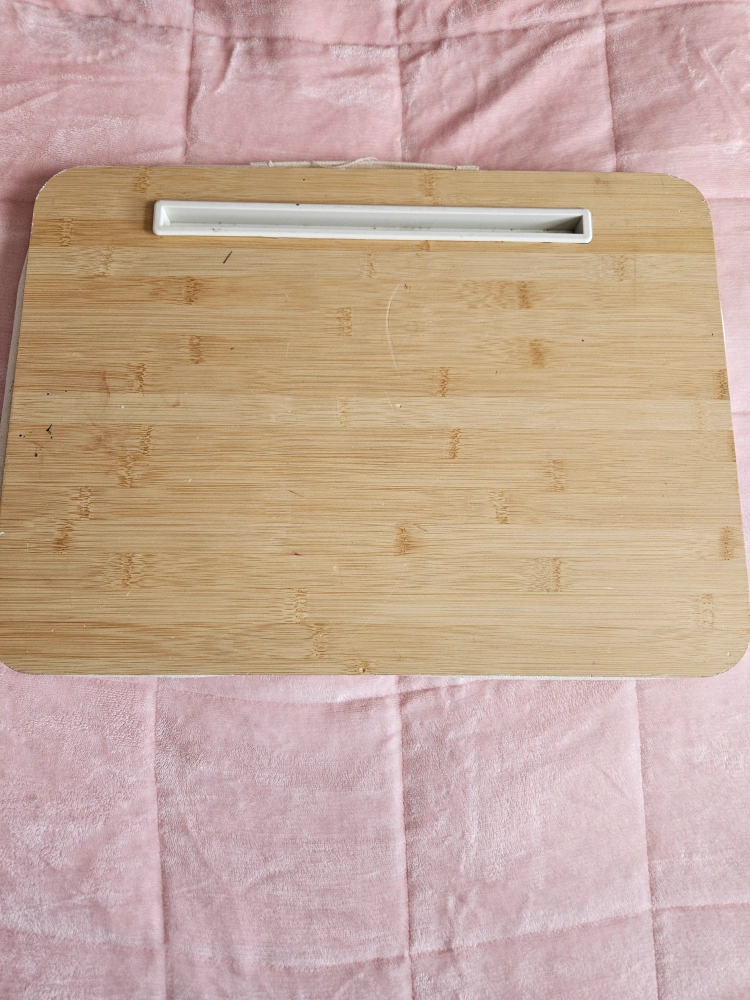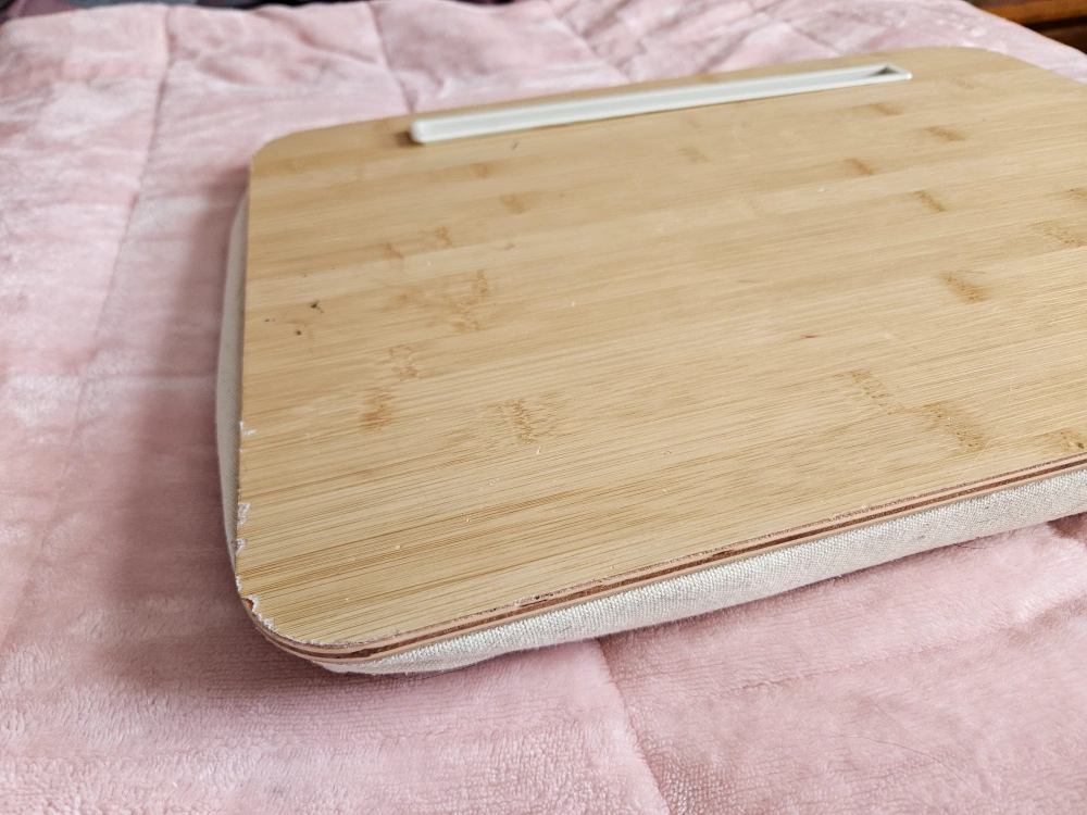 Lightly used bamboo laptop bed tray. Features a cushioned base and a small handle. Perfect for working from bed or on the couch.