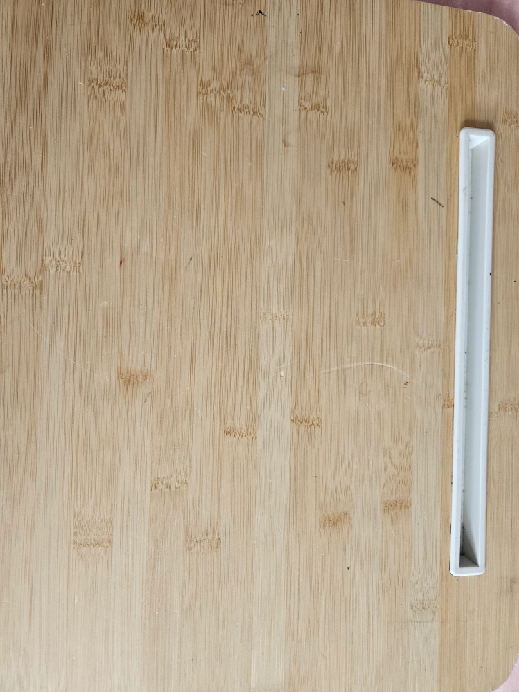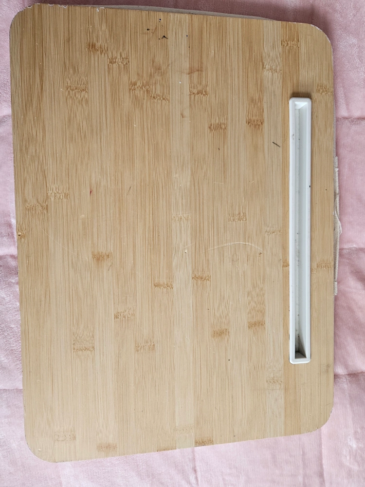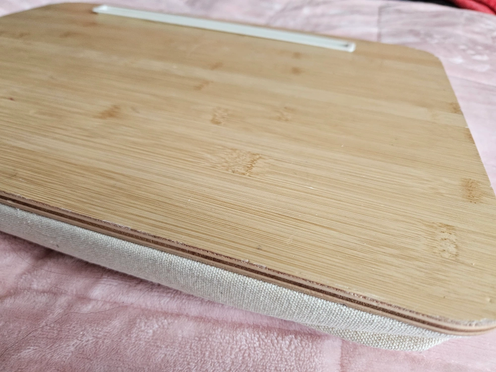 Lightly used bamboo laptop bed tray. Features a cushioned base and a small handle. Perfect for working from bed or on the couch.