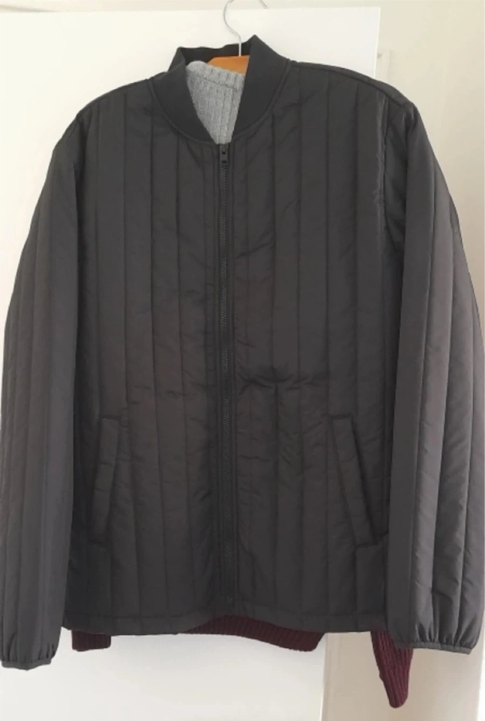 Here's a black quilted bomber jacket. It appears to be in good condition and ready for a new home! Perfect for layering during those cooler Canadian days