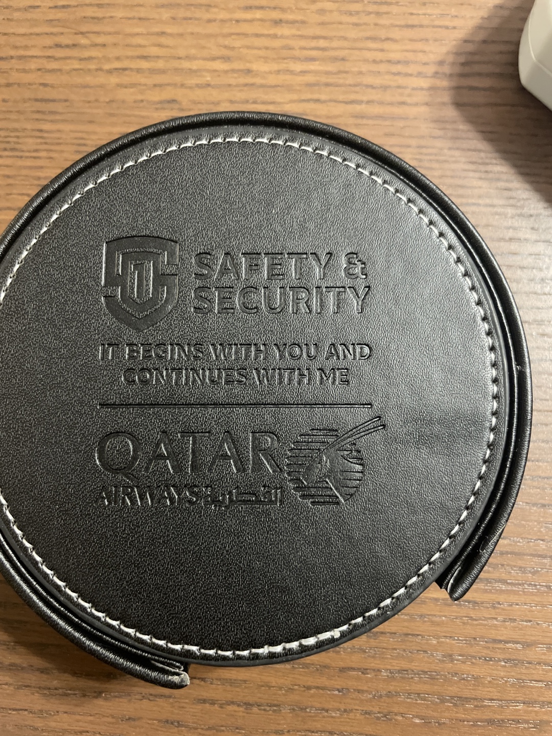 Giving away a set of 6 - Qatar Airways coasters! These black coasters feature the Qatar Airways logo and the phrase 'Safety & Security: It begins with you and continues with me'