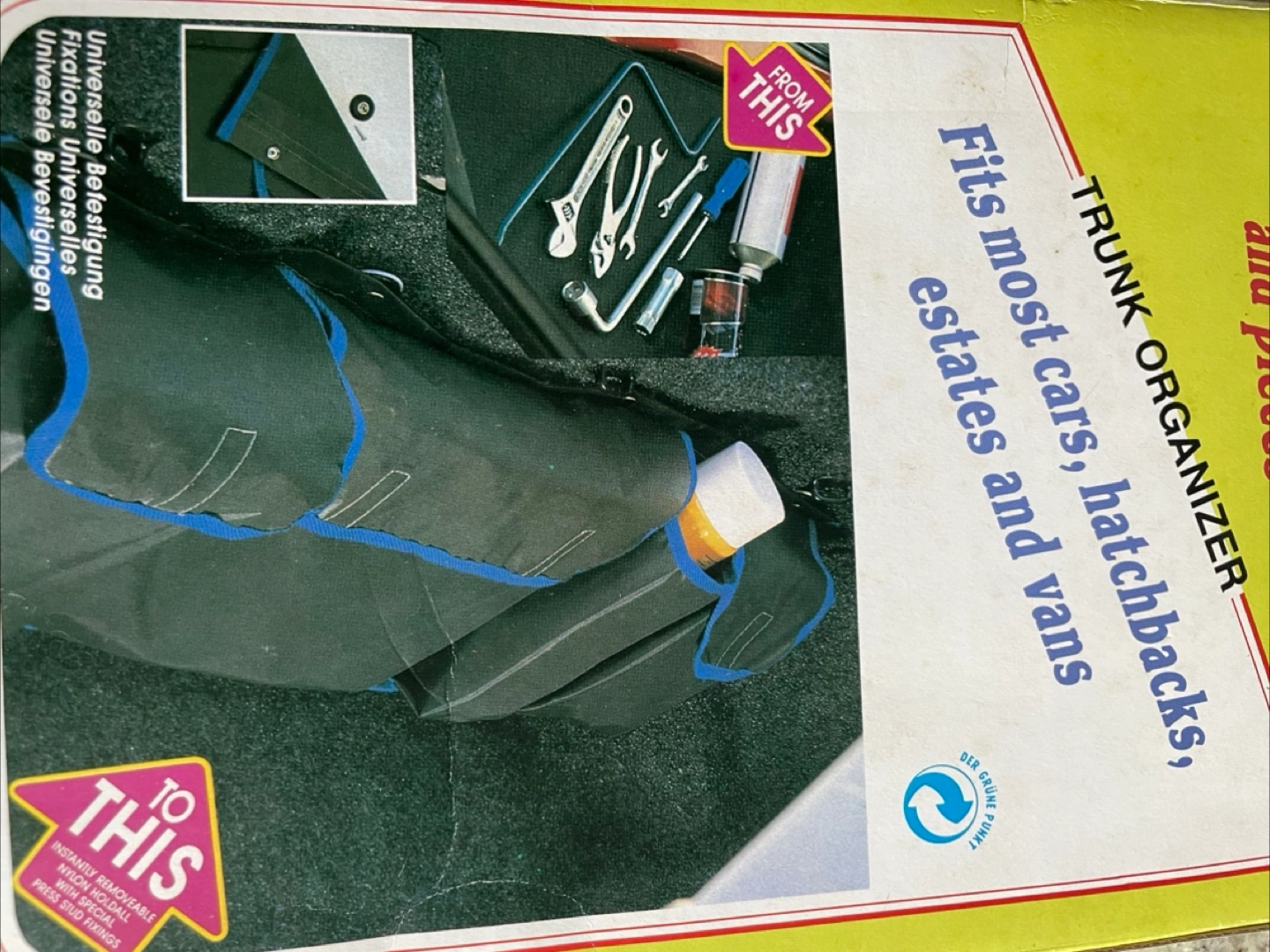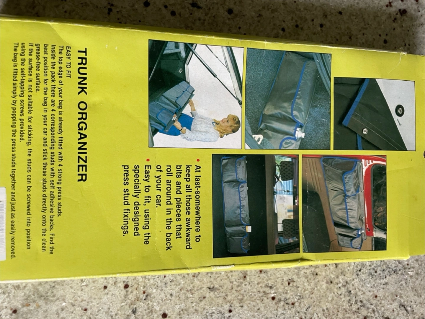 Keep your car trunk tidy with this trunk organizer! It's designed to fit most cars, hatchbacks, estates, and vans and trucks. Easy to lift in and out, it's made from strong, waterproof-backed nylon. It helps keep all those awkward bits and pieces that roll around in the back of your car organized. Can be used as wall storage in the garage.