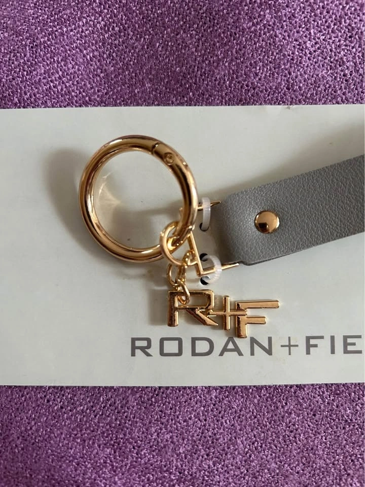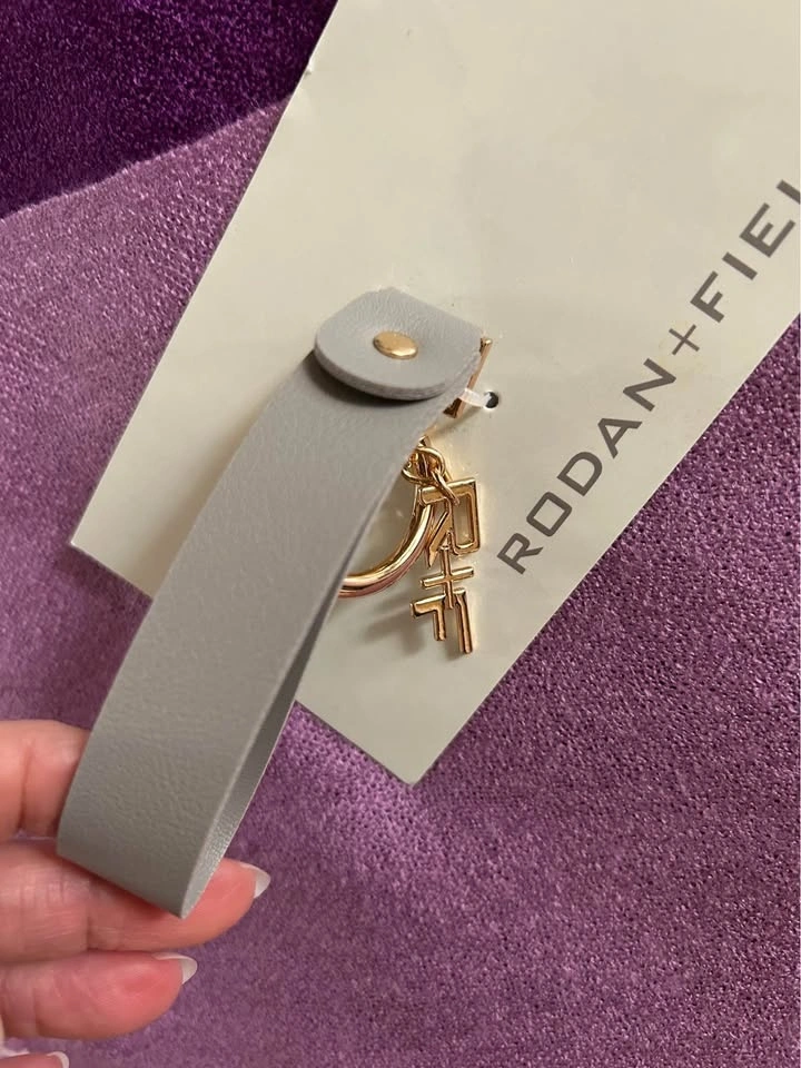 Brand new Rodan + Fields grey leather keychain with a gold-tone metal signature R&F charm. Features a sleek grey leather wrist strap, combining functionality with elegance. Lightweight and easy to attach your keys. The grey strap measures approx. 4" long & 1" wide. Pick up in the Warden and Highway 7 area in Markham. Smoke and pet free home. Cash only.