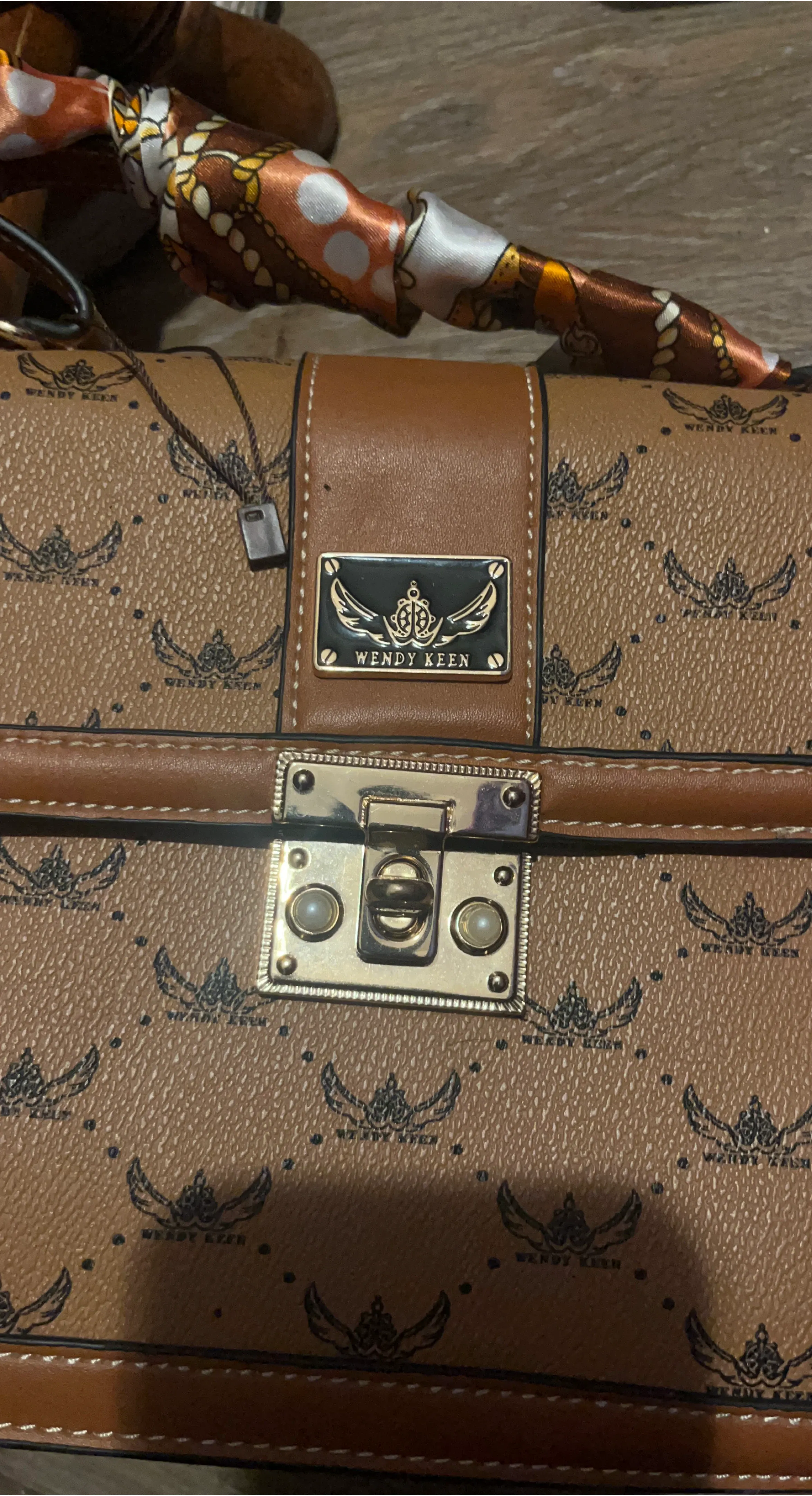 This is a stylish Wendy Keen handbag. It features a brown faux leather exterior with the brand's signature logo pattern. The bag has a secure clasp closure and decorative metal accents.
