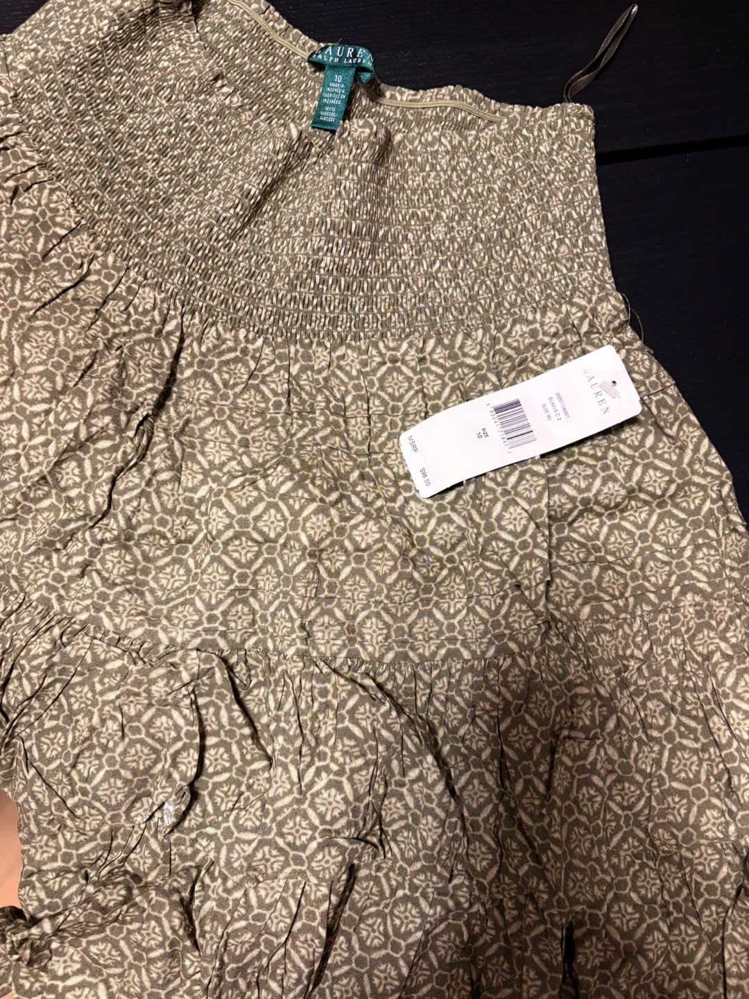 Lauren Ralph Lauren women's smocked tiered skirt. It's a size 10 with a green and cream geometric pattern. Smocked bodice with a tiered skirt design.