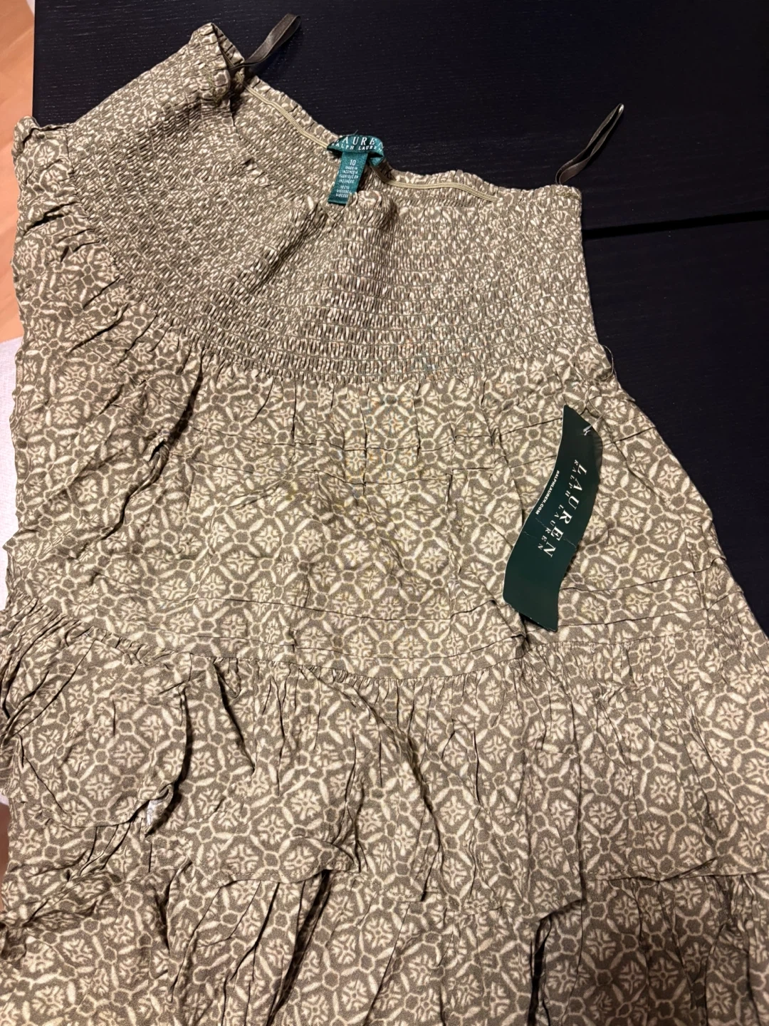 Lauren Ralph Lauren women's smocked tiered skirt. It's a size 10 with a green and cream geometric pattern. Smocked bodice with a tiered skirt design.