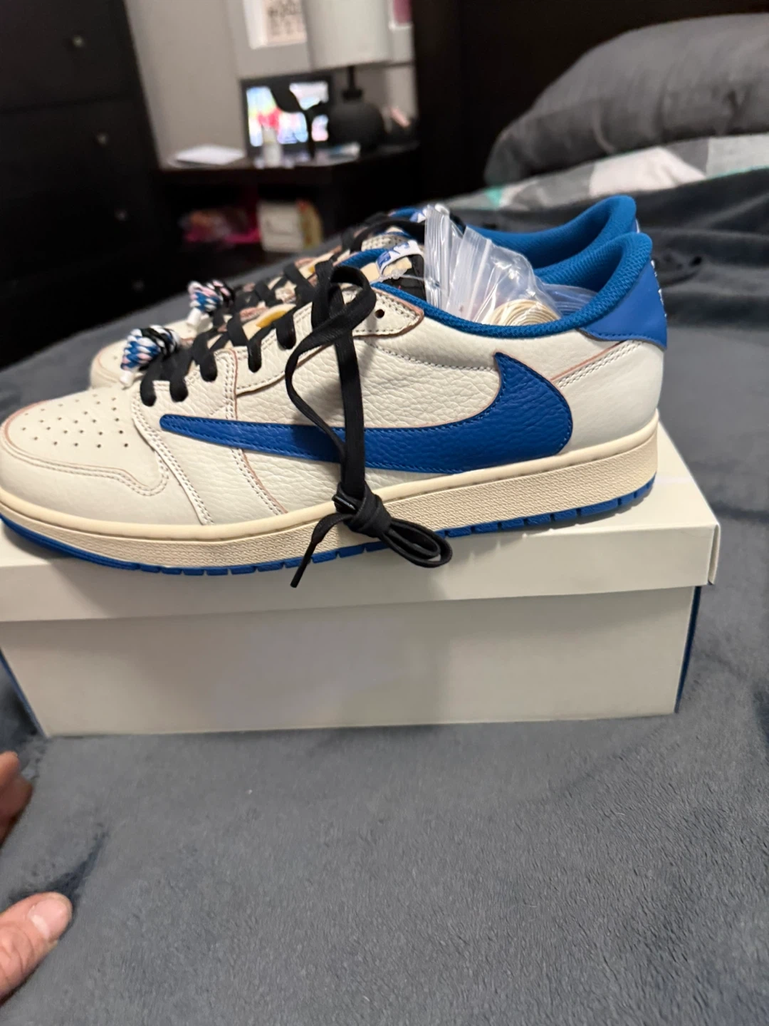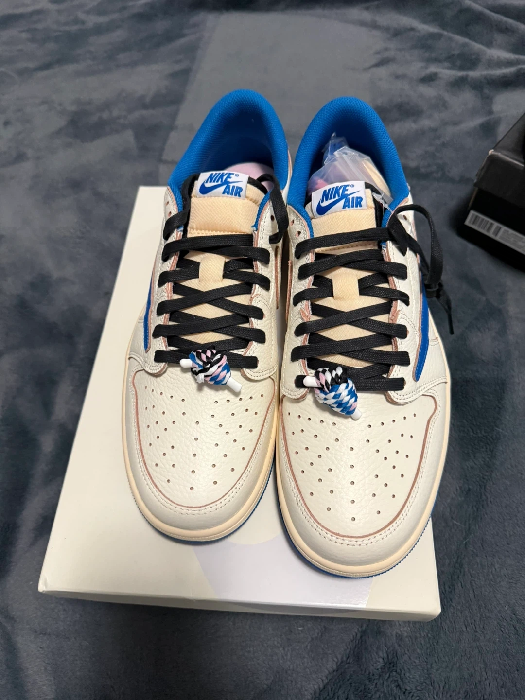These iconic low-top sneakers feature a cream leather base with blue accents and Travis Scott detailing. Includes extra laces and the original box.