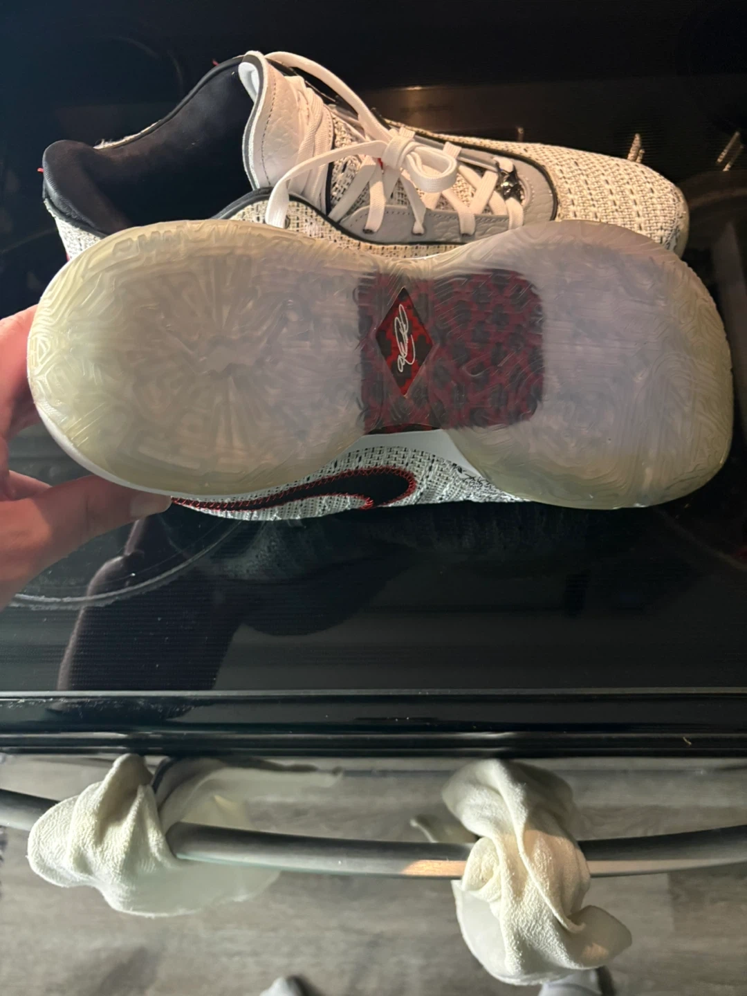 These are Nike basketball shoes with a white and grey knit upper. They feature a red and gold Nike swoosh and a transparent sole with red accents. Lace-up closure for a secure fit.