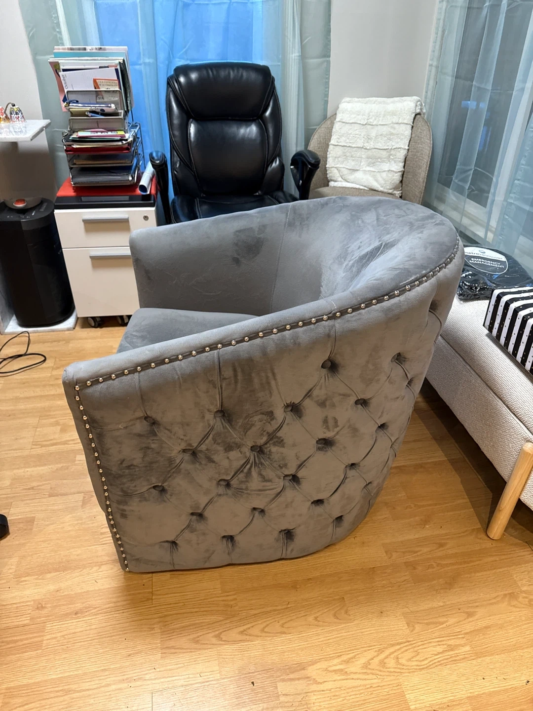 Selling a stylish grey velvet swivel accent chair. It's in great condition and would look lovely in any living room or bedroom. The swivel feature makes it super convenient and comfy! It has a rounded back and silver nailhead trim.