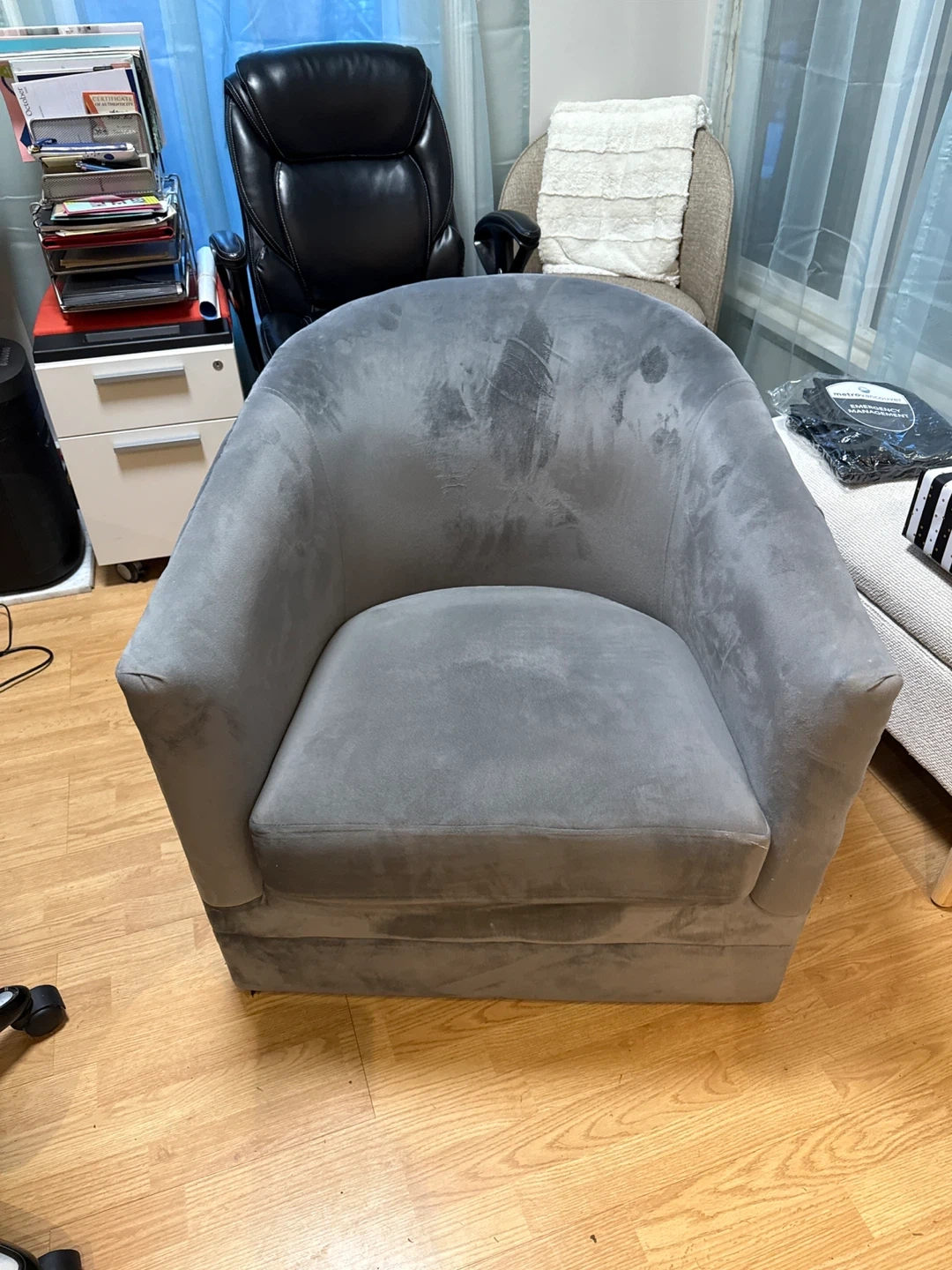 Selling a stylish grey velvet swivel accent chair. It's in great condition and would look lovely in any living room or bedroom. The swivel feature makes it super convenient and comfy! It has a rounded back and silver nailhead trim.