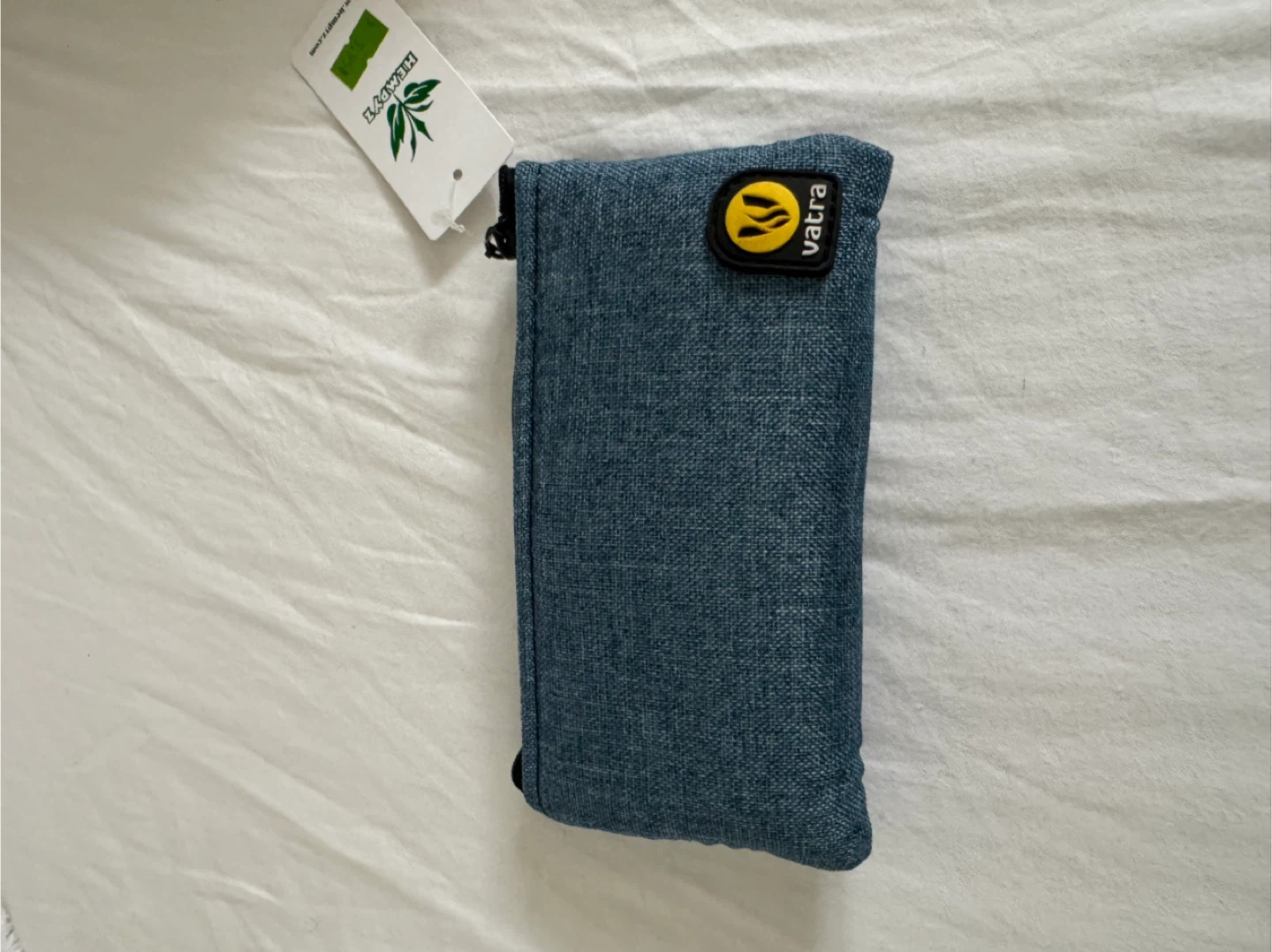 Vatra pouch in a blue denim-like fabric. It features a small yellow logo patch on the front. This is a handy pouch for everyday items.