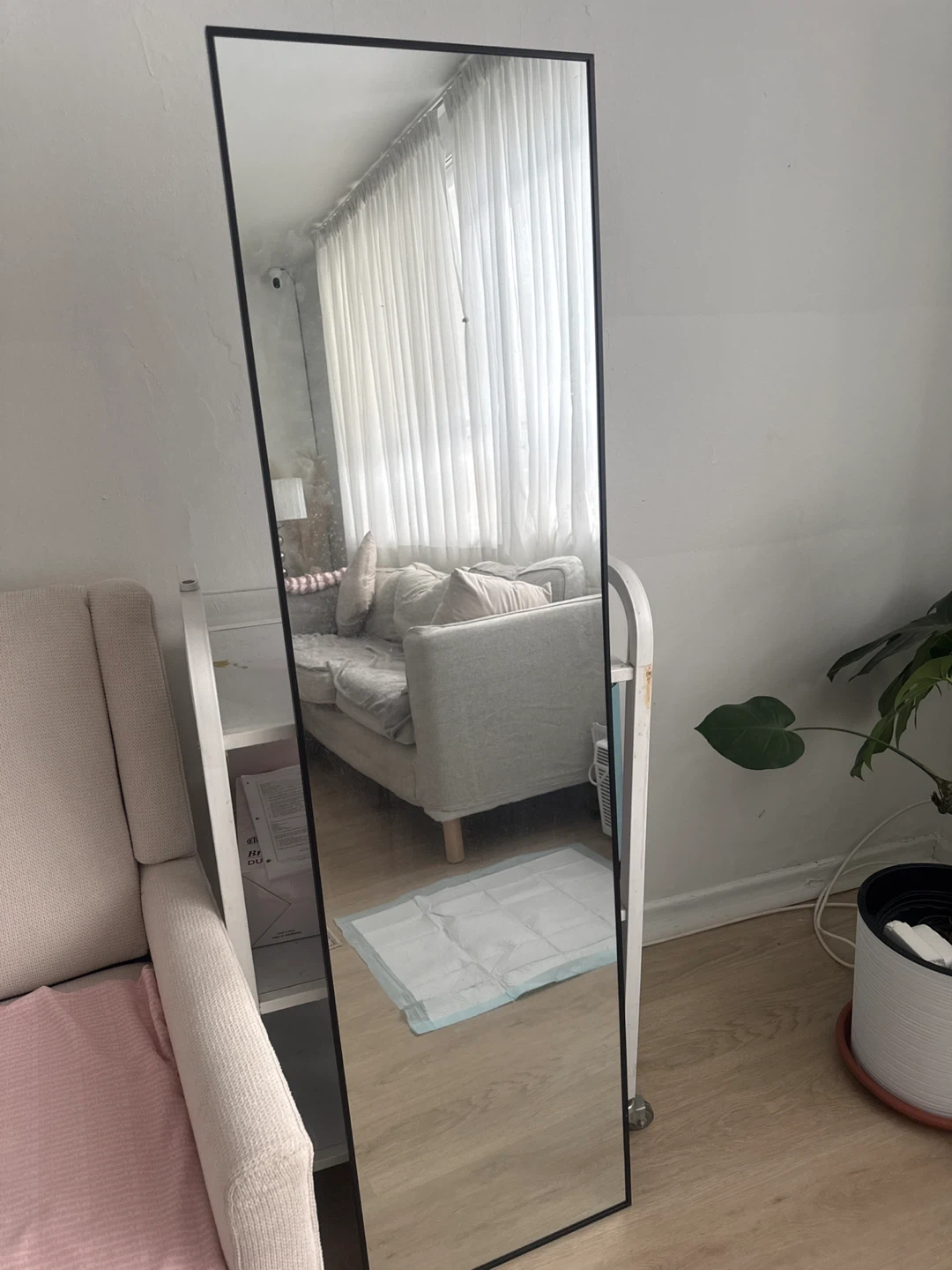 This is a tall, full-length mirror with a slim black frame. It's perfect for checking your outfit before heading out! The reflective surface is clear and ready for use.