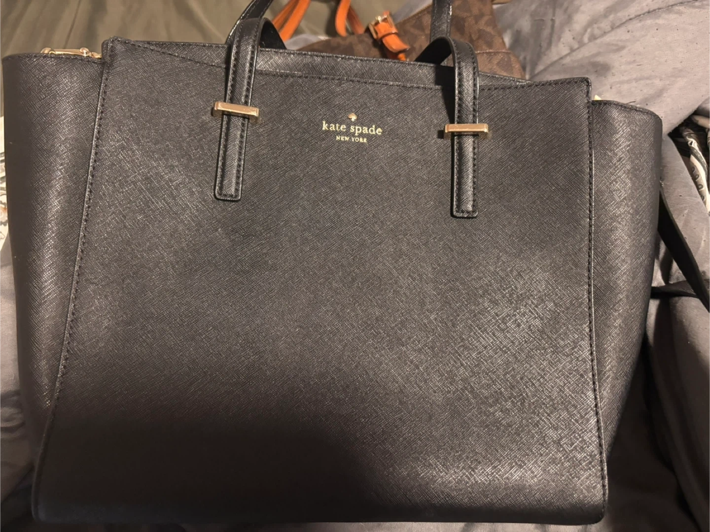 This is a Kate Spade New York tote bag made of black saffiano leather. It features a zip-top closure and gold-tone hardware. The interior is spacious and perfect for everyday essentials.