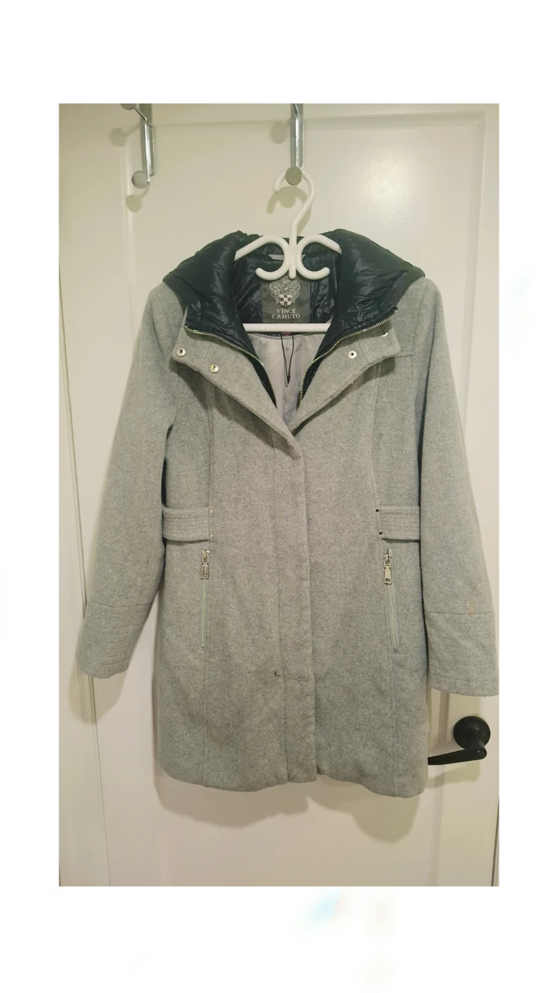 This is a Vince Camuto women's wool blend coat in a light grey colour. It features a quilted black inner collar and zippered pockets. A stylish and warm option for cooler weather!