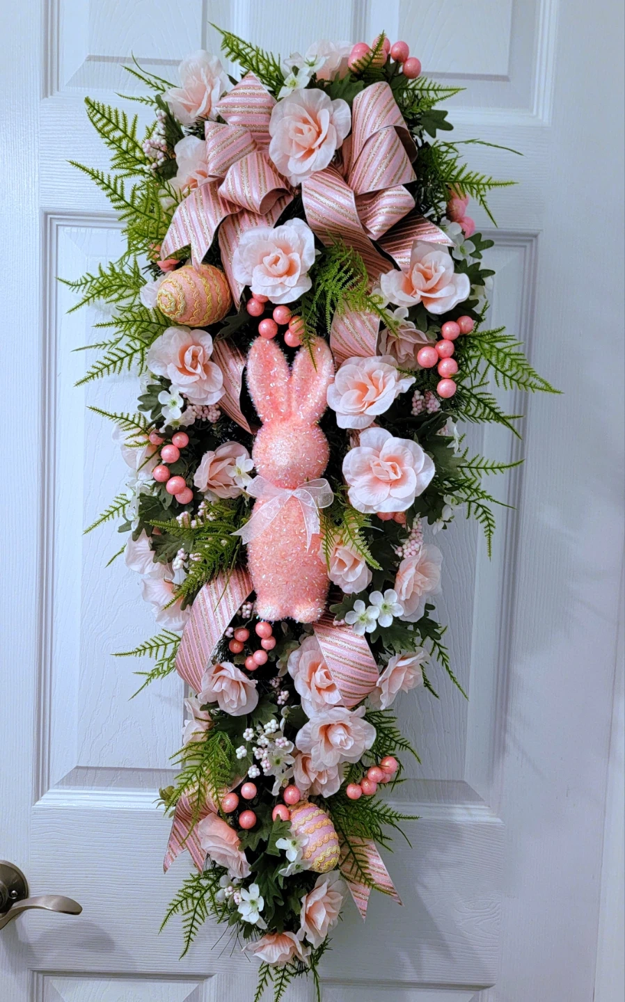 This is a beautiful Easter door swag. It features a sparkly pink bunny, artificial roses, greenery, decorative Easter eggs, and pink striped ribbon. It's perfect for welcoming spring and adding a festive touch to your home!