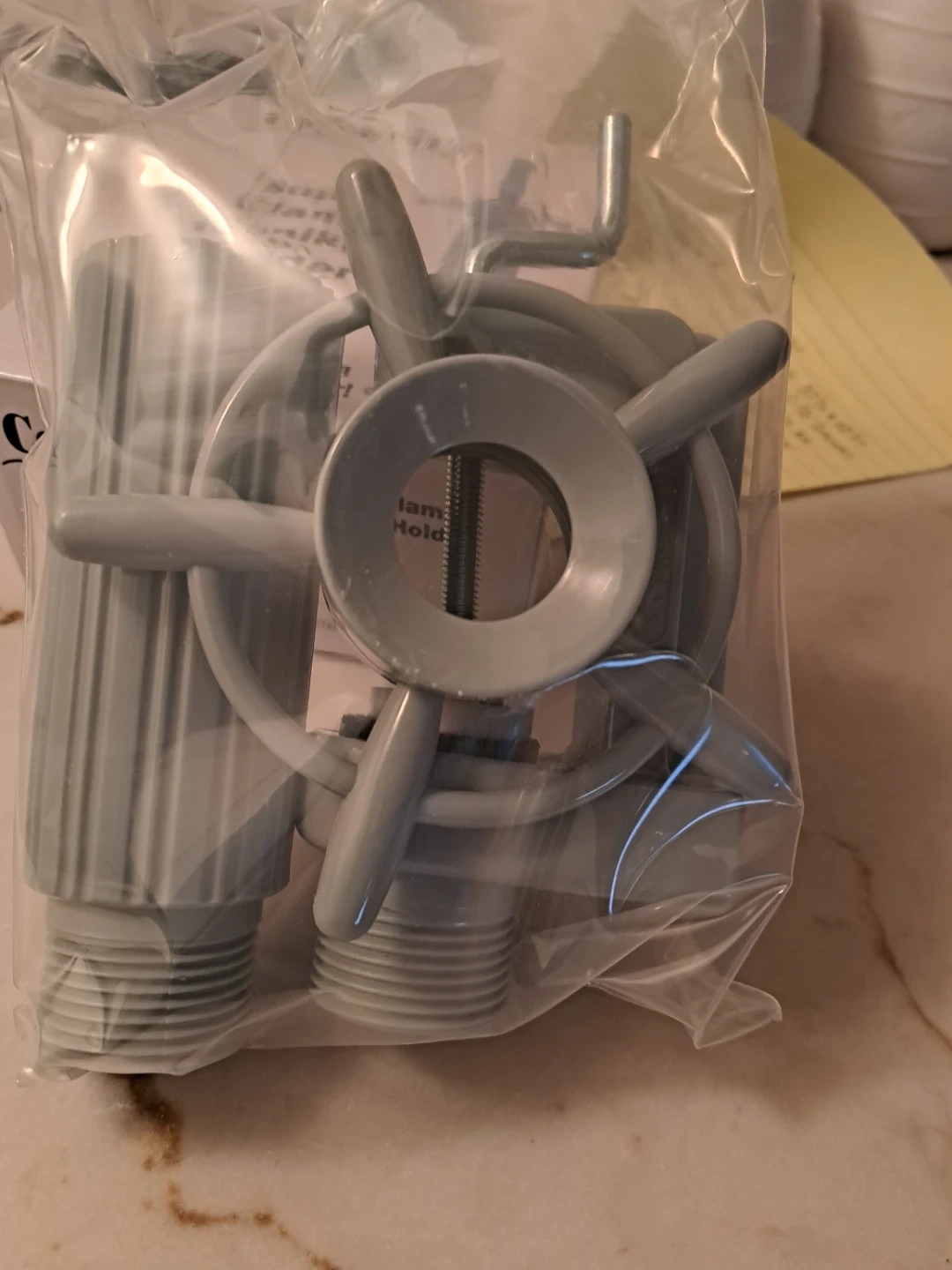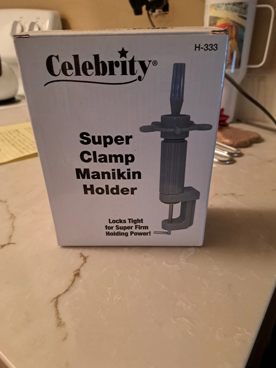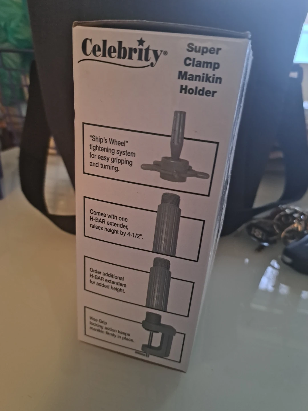 This is a Celebrity Super Clamp Manikin Holder. It features a "Ship's Wheel" tightening system for easy gripping and turning. Comes with one H-BAR extender, raises height by 4-1/2". Vise grip action keeps manikin firmly in place.