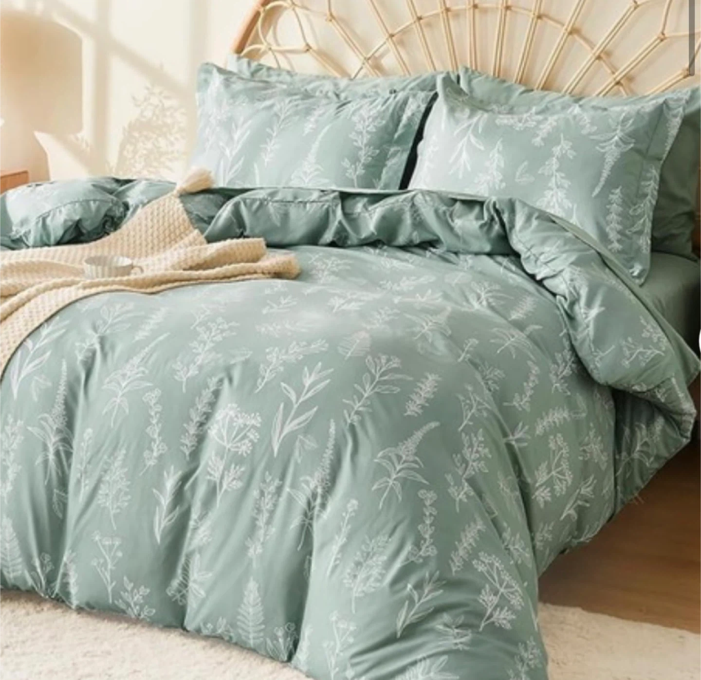 Stunning MUXHOMO queen comforter set. Pretty sage green color with white floral pattern. Gives your bedroom a fresh vibe. Includes comforter and matching pillow shams. Please contact if pick up location works for you.- border of Brampton and Caledon. 5 minutes off Hwy 410 - Mayfield exit