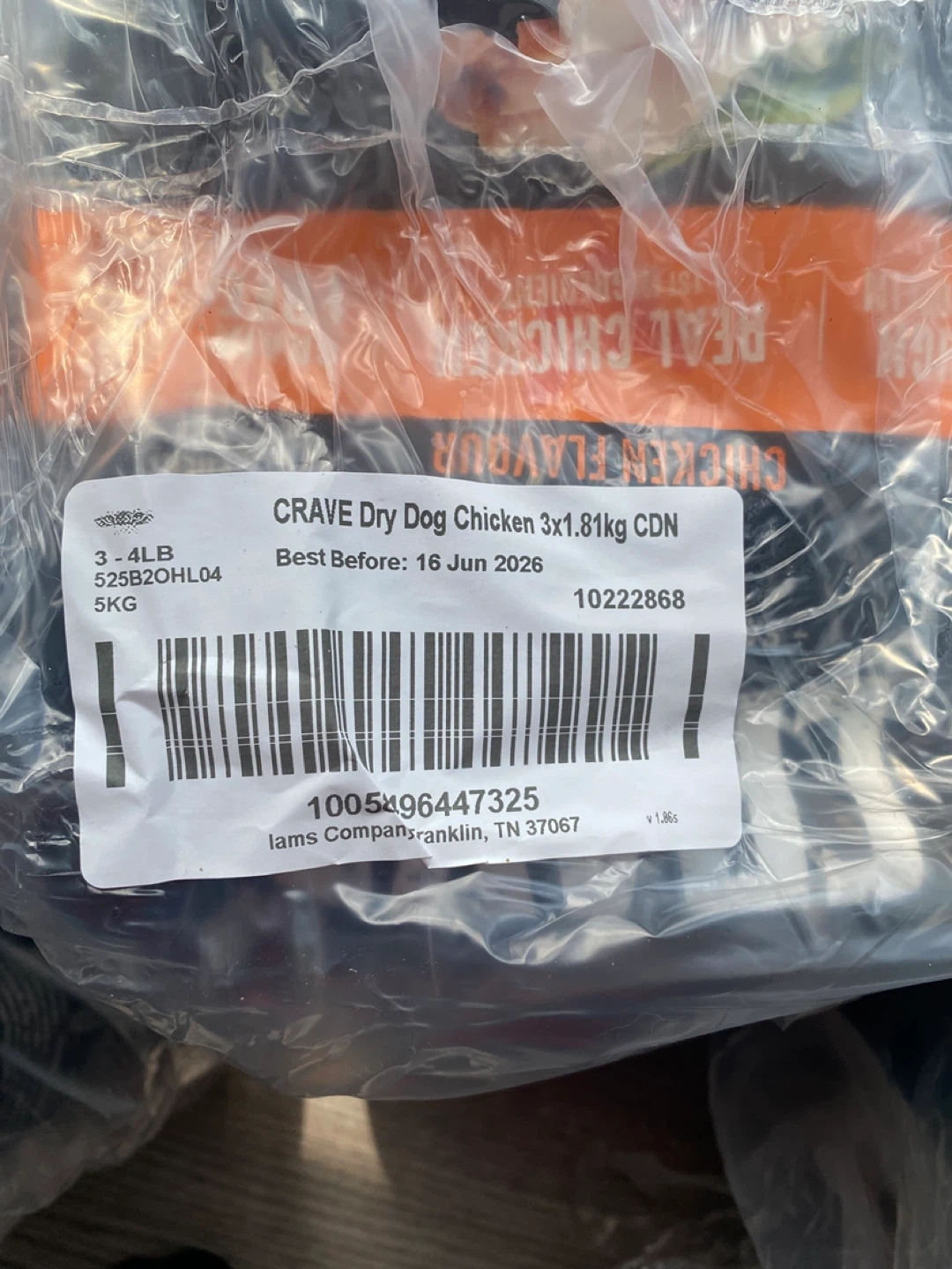 Crave Dry Dog Food in Chicken Flavour. Each bag is 1.81 kg, total 5.43 kg. High protein, real chicken, grain-free formula. Best before 16 Jun 2026.