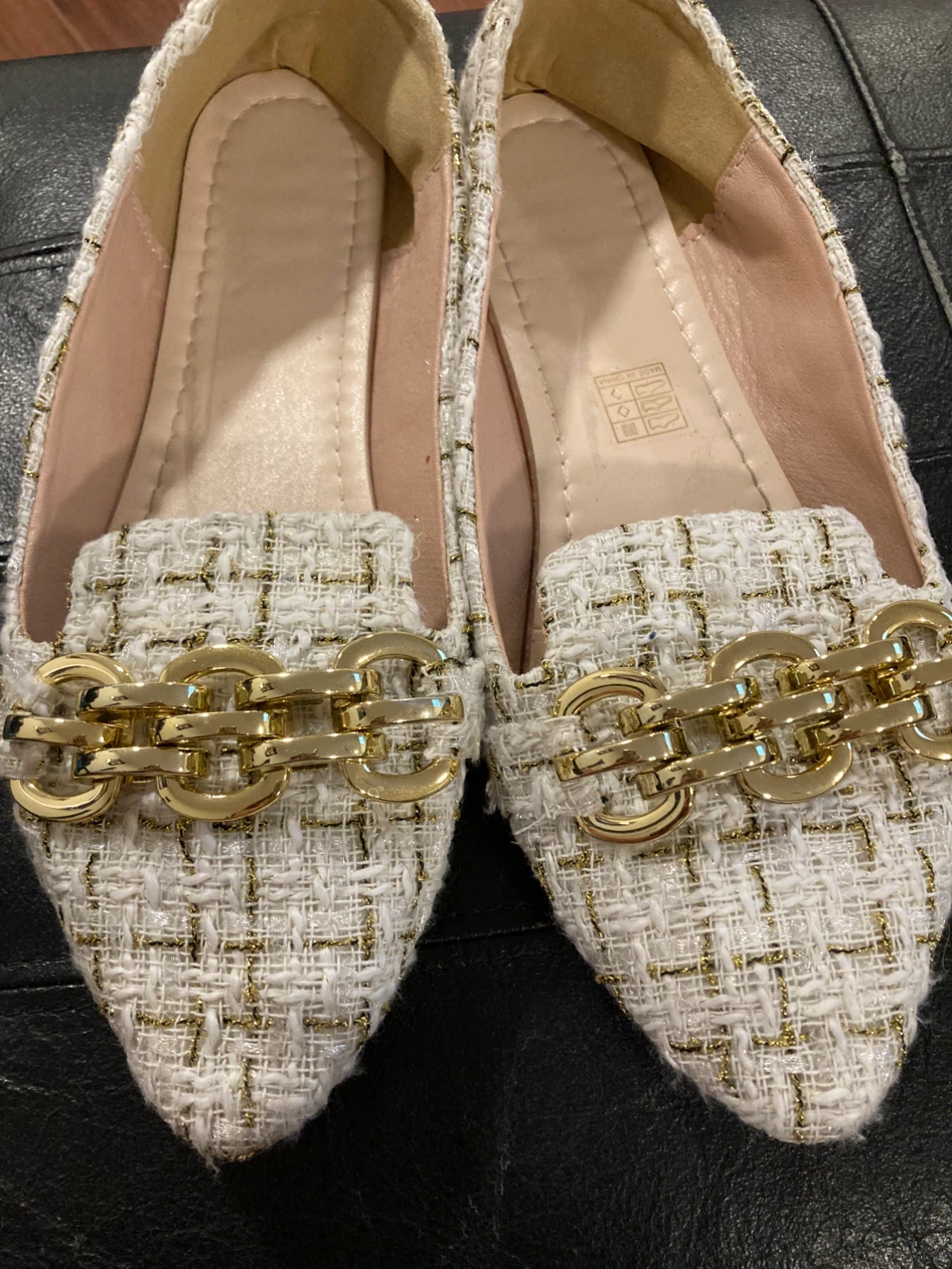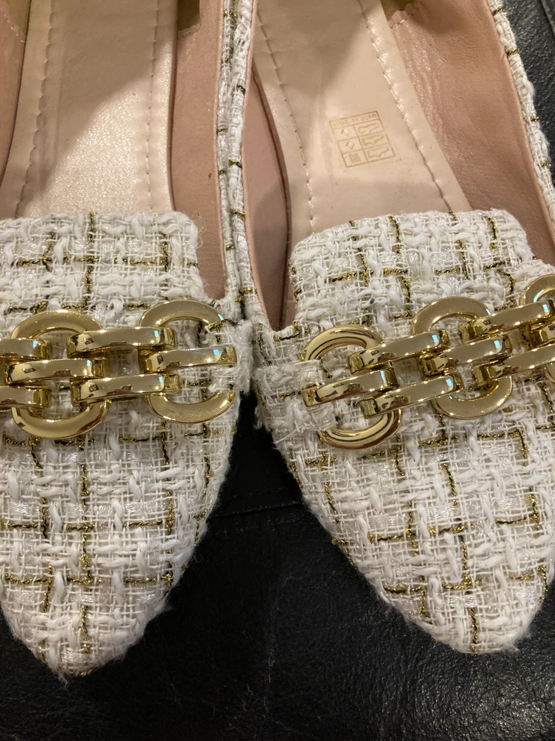 These stylish loafer flats feature a tweed fabric with gold detailing. They have a comfortable slip-on design with a decorative gold chain accent across the vamp. Perfect for adding a touch of chic to any outfit!