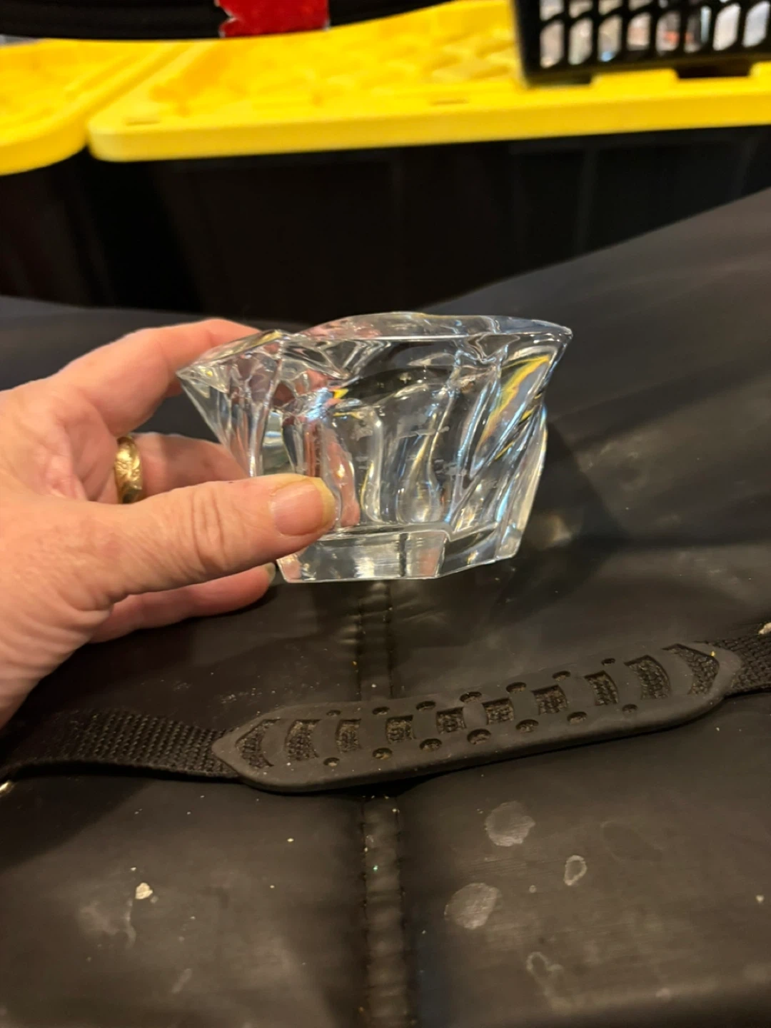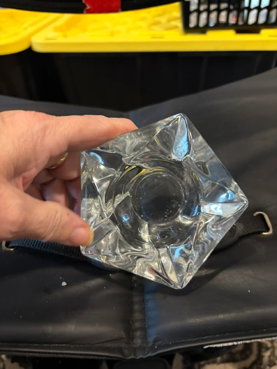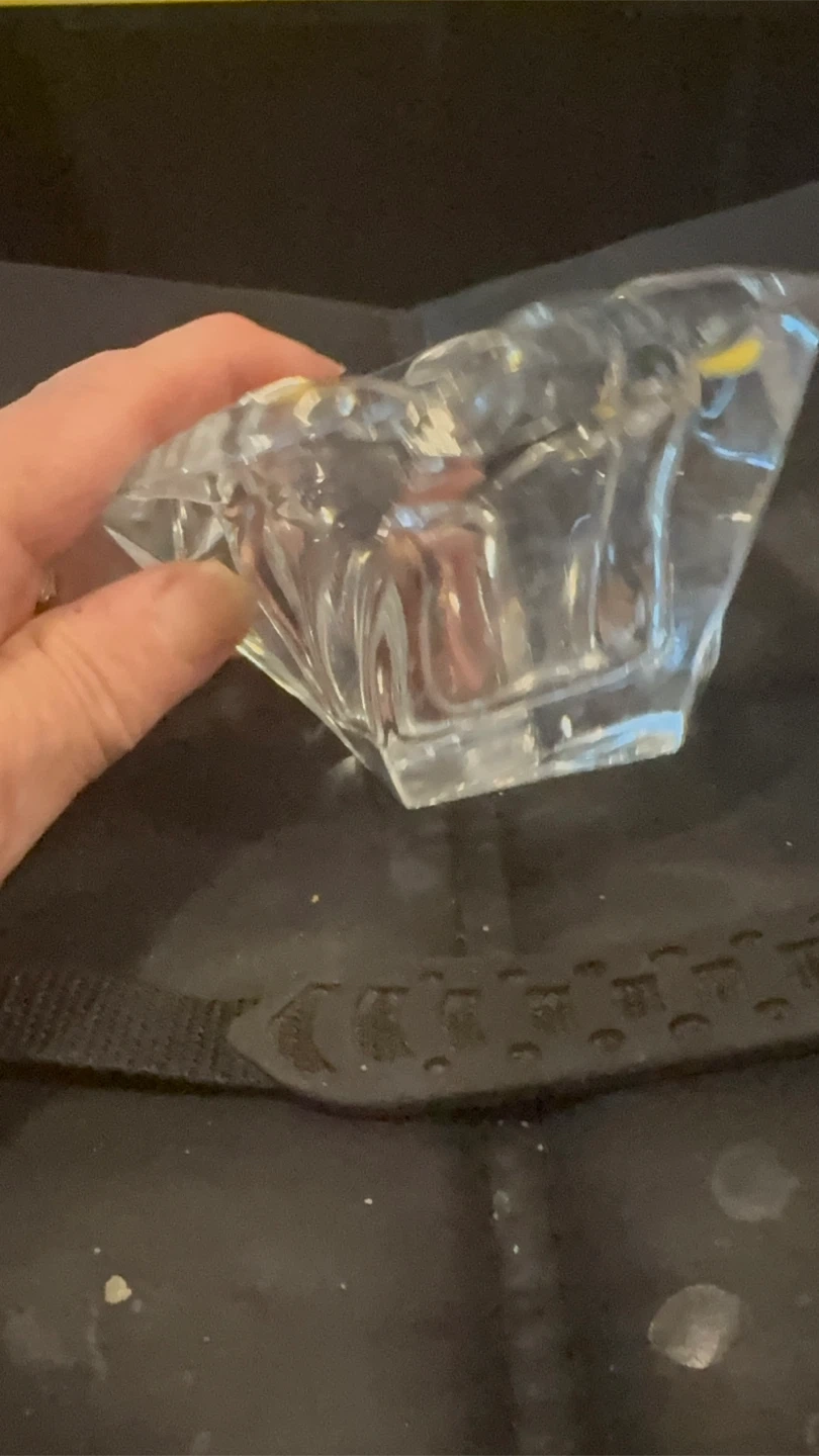 Beautiful crystal glass candlestick holder with a unique geometric design. It's perfect for adding a touch of elegance to any room or for special occasions. There are two available $35 for both or $20 each. They measure approximately 4 inches in height and width.
