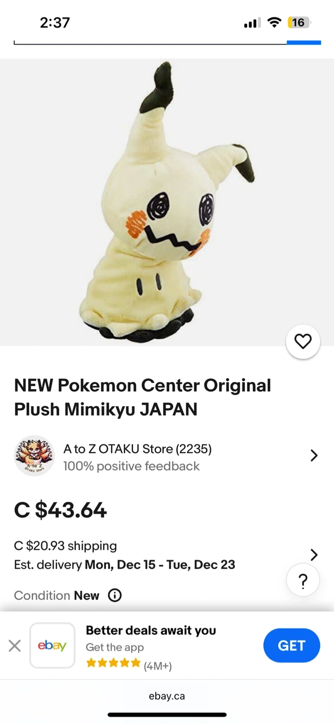 Selling a 10 inch Mimikyu plush toy (from Japan)! It's in great condition and would be perfect for any Pokémon fan. It has a tag attached.