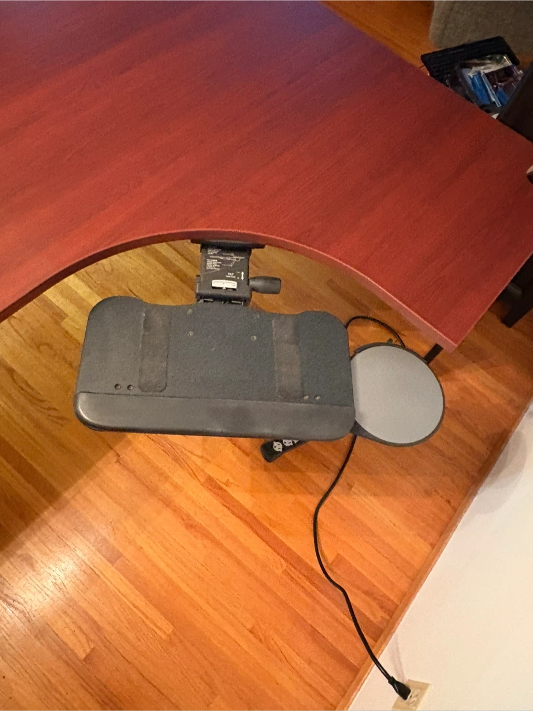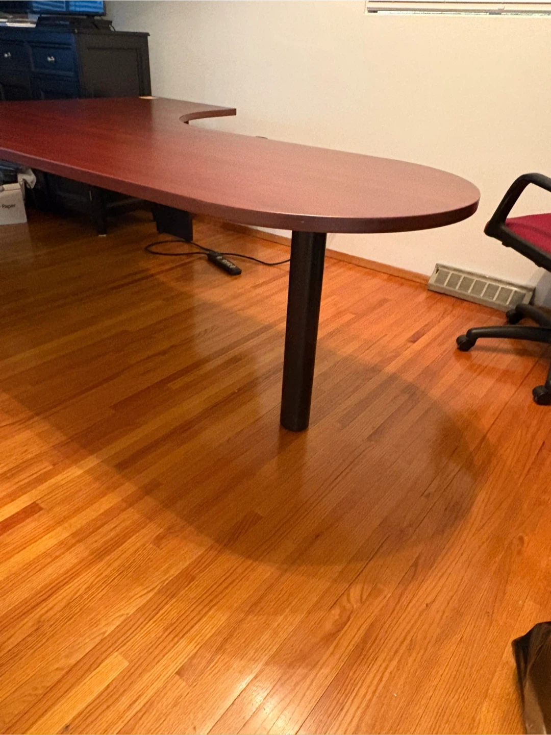 Spacious cherry-wood finish L-shaped desk. 84” L X 54” W x29” H It's designed for ergonomic comfort with a curved front edge. Includes a pull-out keyboard tray and a mouse platform. Plenty of surface area for multiple monitors and work essentials! Approx 7ft L by 4.6ft W