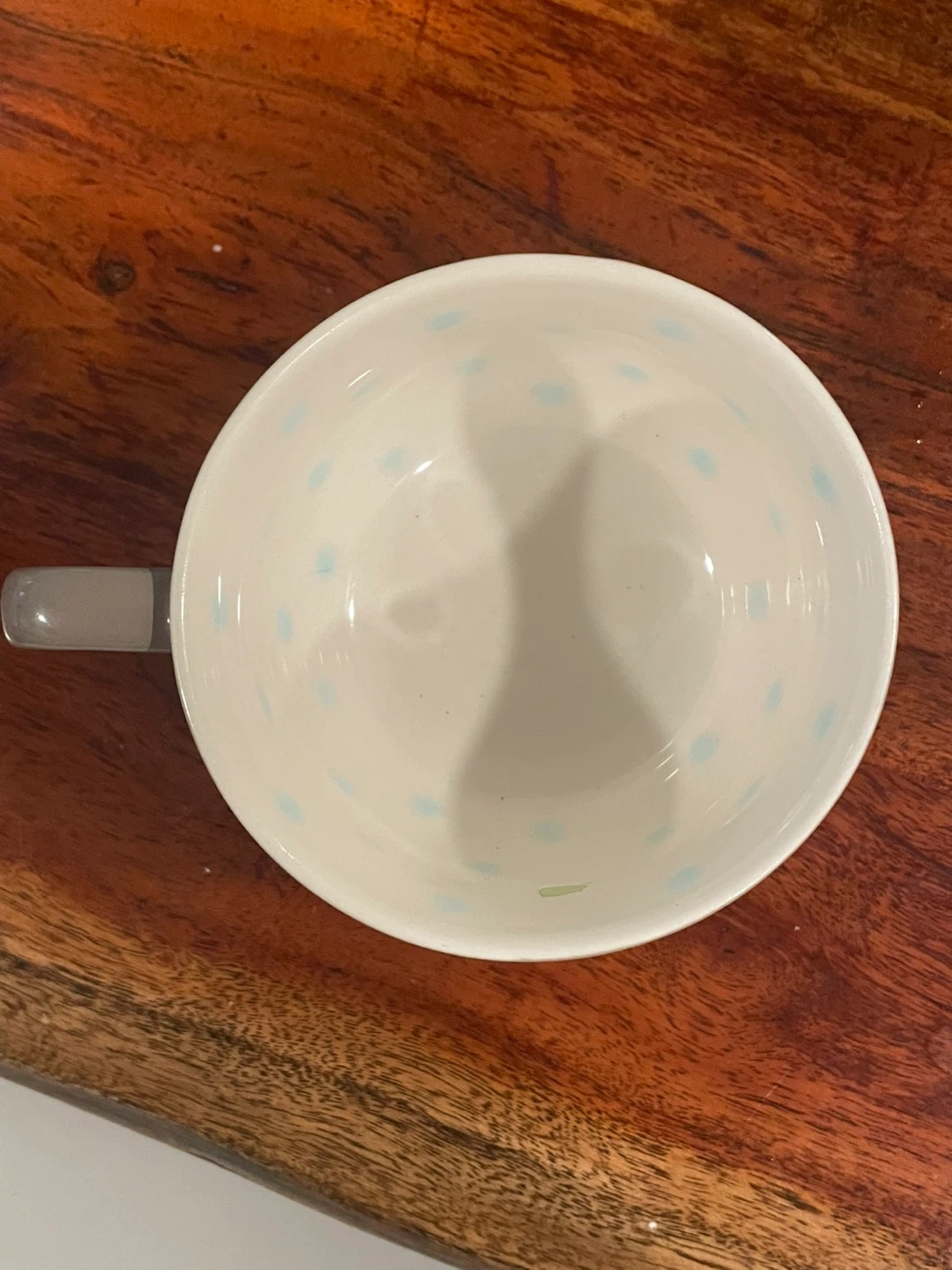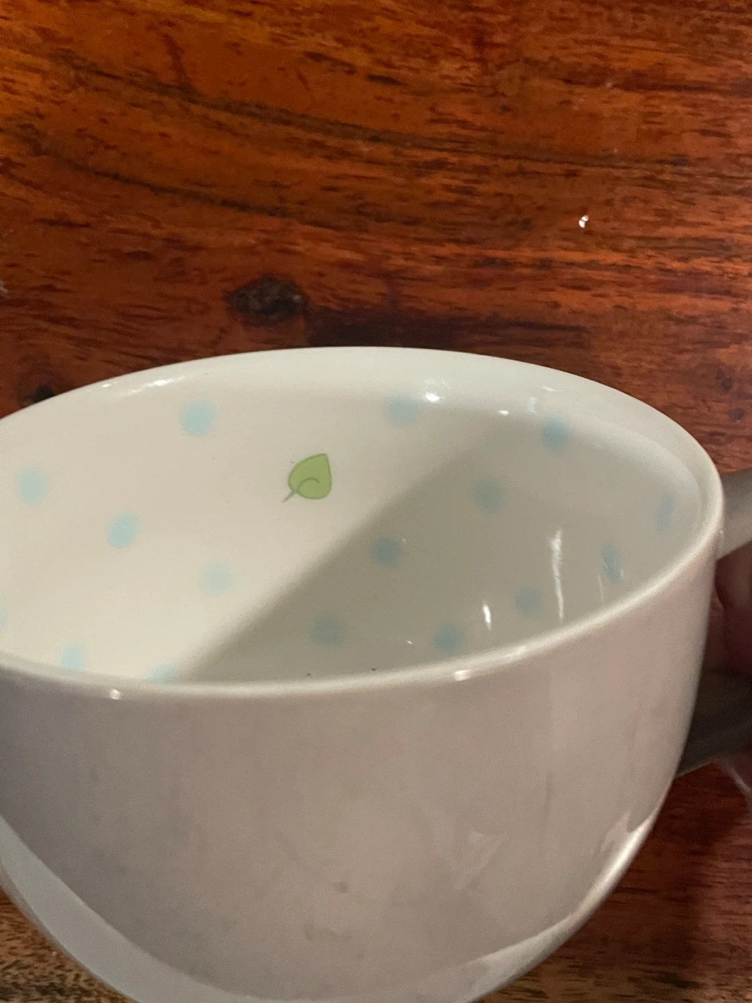Selling a cute Starbucks coffee mug. It has a grey handle and base, with white interior and exterior. There are light blue polka dots and a small green leaf design inside.