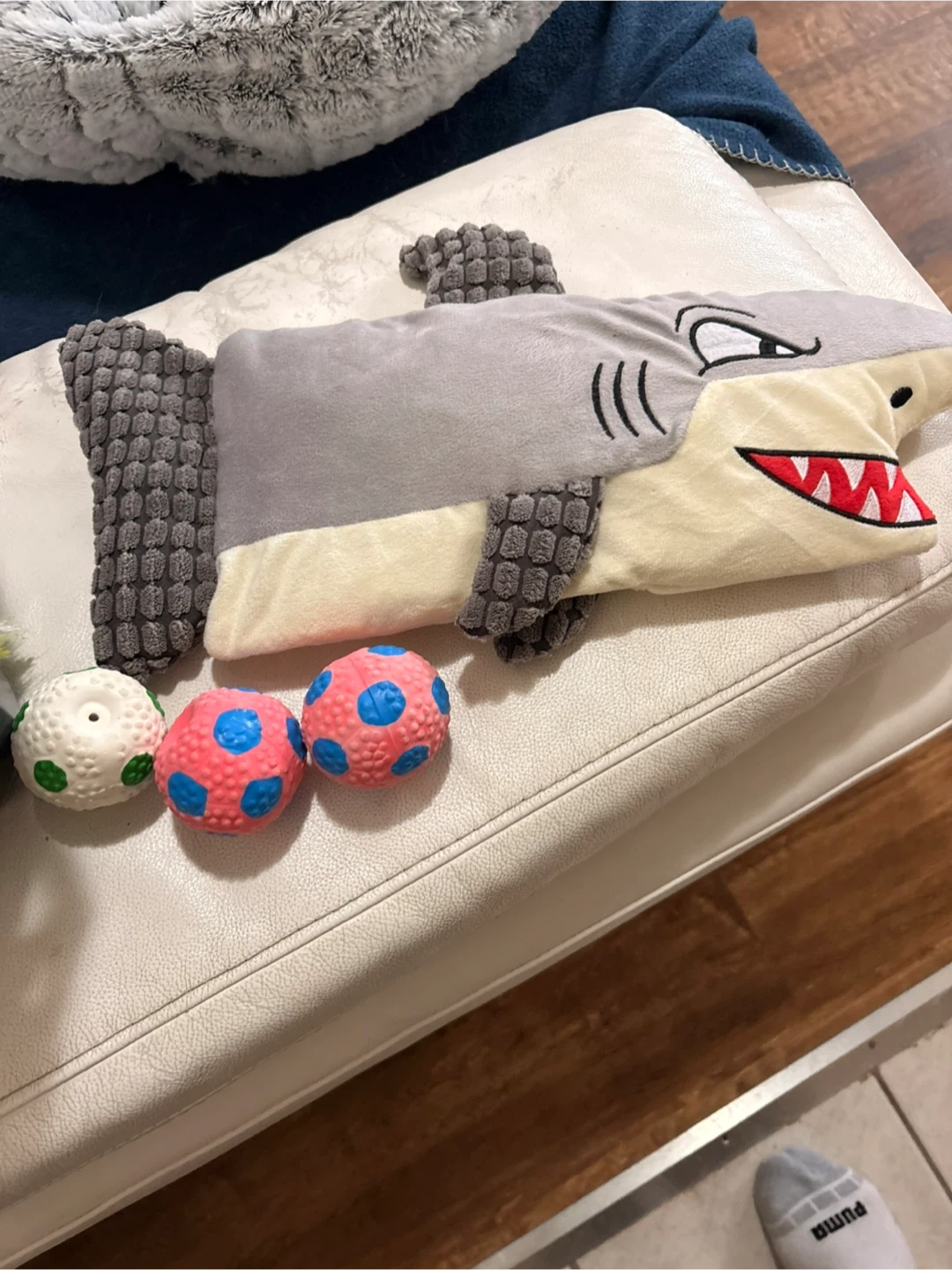 Plush shark dog toy with squeaker, alongside a soft, grey fluffy pet bed. Both items are gently used. The shark toy measures approximately 18 inches long. The pet bed is suitable for small to medium-sized pets.
