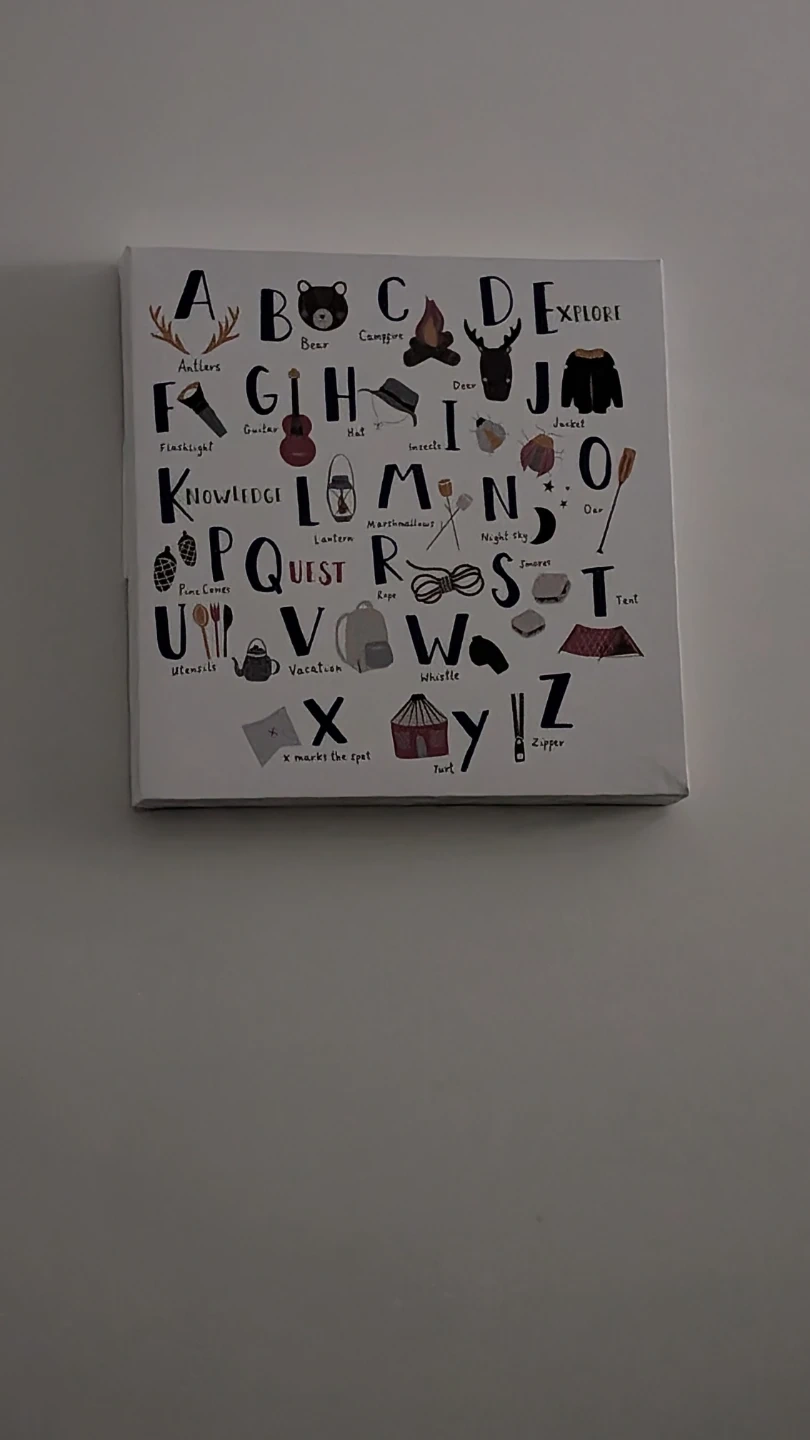 Canvas art featuring camping-themed alphabet illustrations. It includes camping gear, animals, and outdoor scenes. This piece is great for a child's room or nature enthusiast!