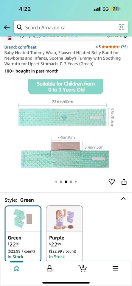 Baby Heated Tummy Wrap, Flaxseed Heated Belly Band for Newborns and Infants, Soothe Baby's Tummy with Soothing Warmth for Upset Stomach, 0-3 Years. The picture is in green but I have blue color. Retail on Amazon for 23$