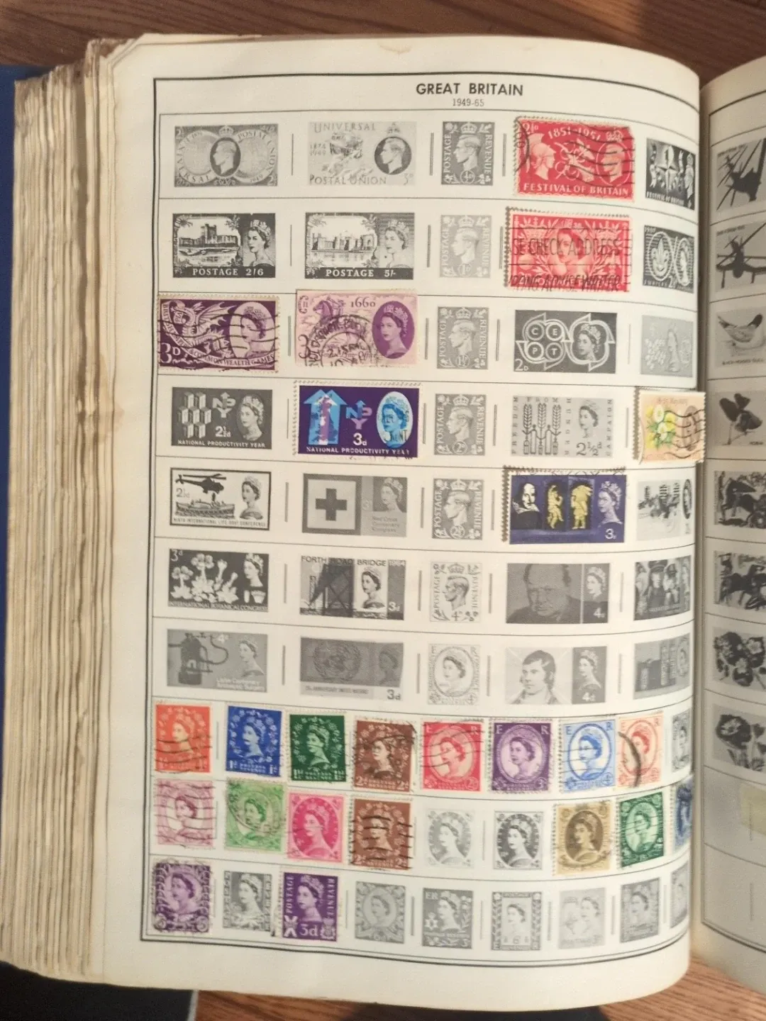 A collection of Great Britain postage stamps from 1949-65. Features various designs including the Festival of Britain and National Productivity Year issues. Stamps include denominations like 2/6, 5/-, and 3d.